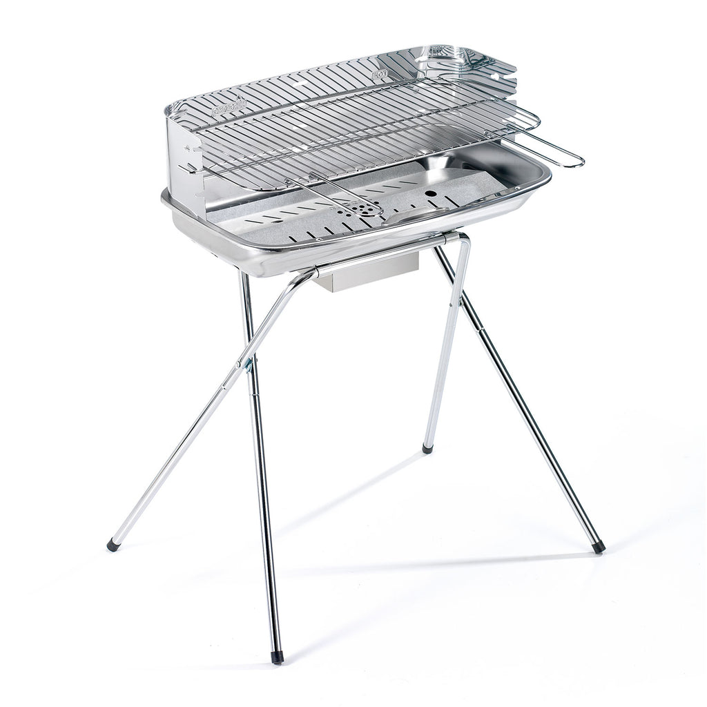 Barbecue in acciaio inox. Griglia di cottura in acciaio cromato regolabile in 4 posizioni certificata per alimenti, con manici richiudibili. Raccogli cenere e dispositivo brevettato d’accensione facilitata con cassetto estraibile in acciaio inox. Paravento in acciaio inox con innesto di sicurezza e bordo antigraffio. Robusto braciere in acciaio alluminato. Gambe a cavalletto in acciaio inox con innesto a baionetta. MADE IN ITALY