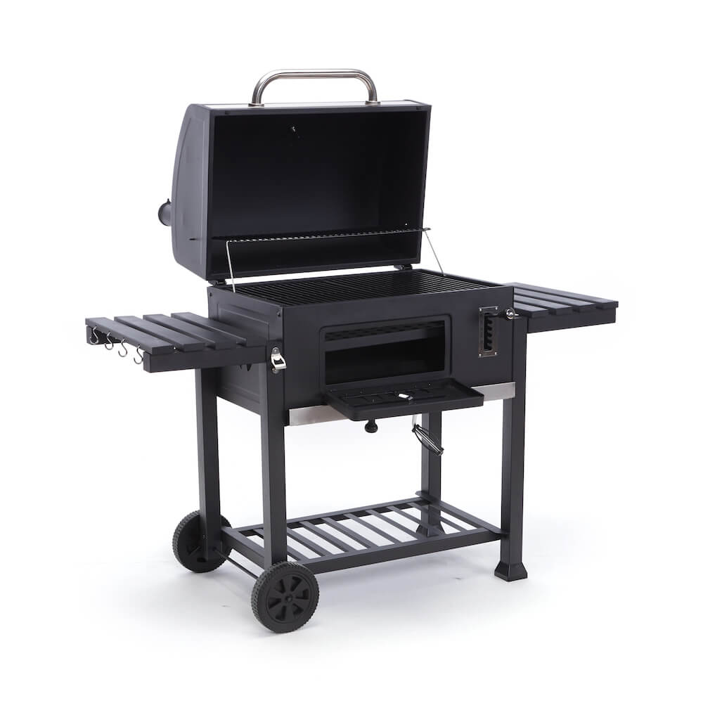 Barbecue a carbonella con forno in acciaio verniciato a polvere colore nero (finitura opaca), ripiano inferiore, termometro e camino.Griglia di cottura in acciaio inossidabile 202, braciere regolabile su 6 posizioni, 2 ripiani laterali pieghevoli , carrello con ruote, struttura in ferro verniciato a polvere colore nero (finitura opaca) .