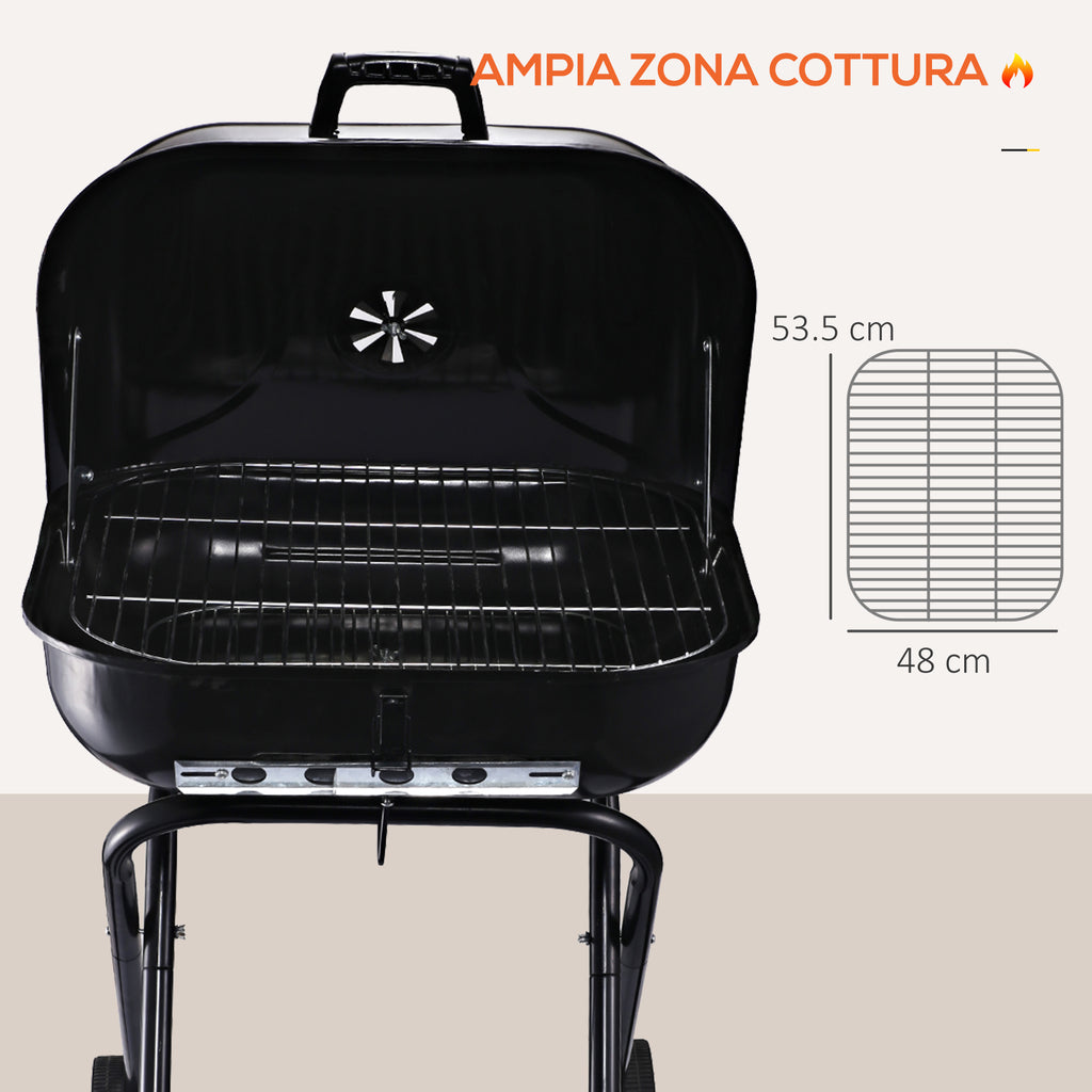 Include due ruote posteriori per trasportare facilmente il barbecue