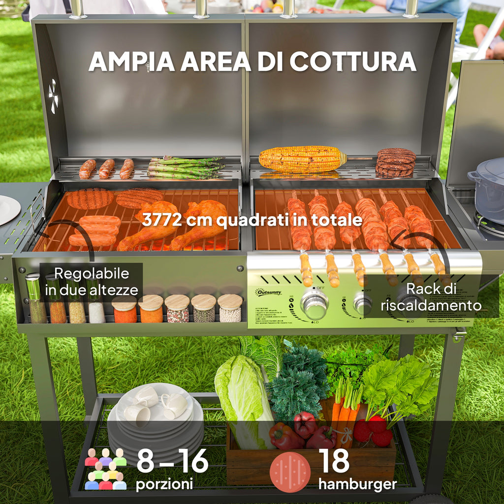 • AMPIA SUPERFICIE DI COTTURA: Offrendo una superficie di 3772 cm², questo barbecue a carbone e gas può accogliere da 8 a 16 persone. Le griglie e l'area carbonella sono regolabili su due livelli di altezza, mentre i ripiani termici inclusi conservano il cibo caldo e saporito