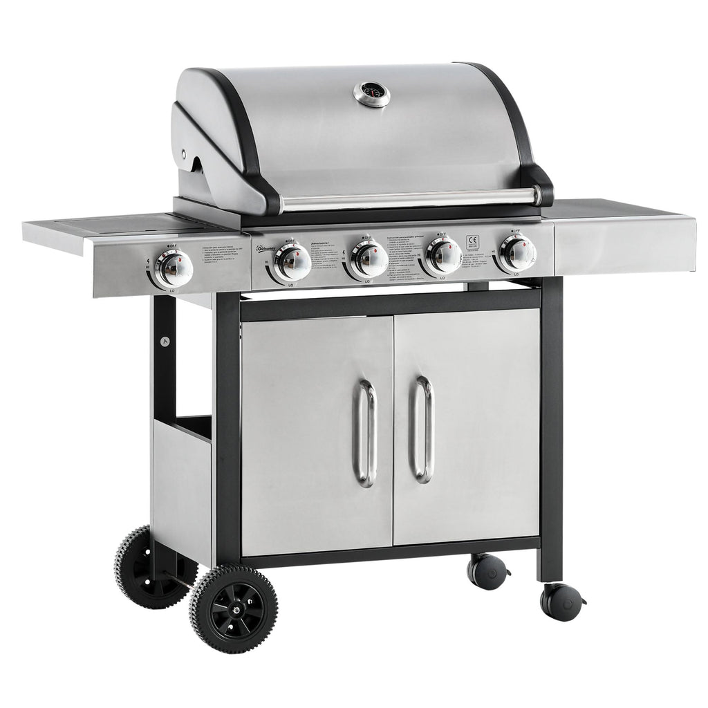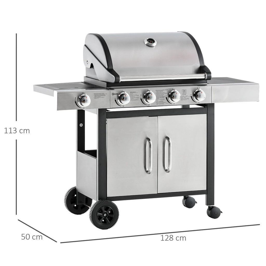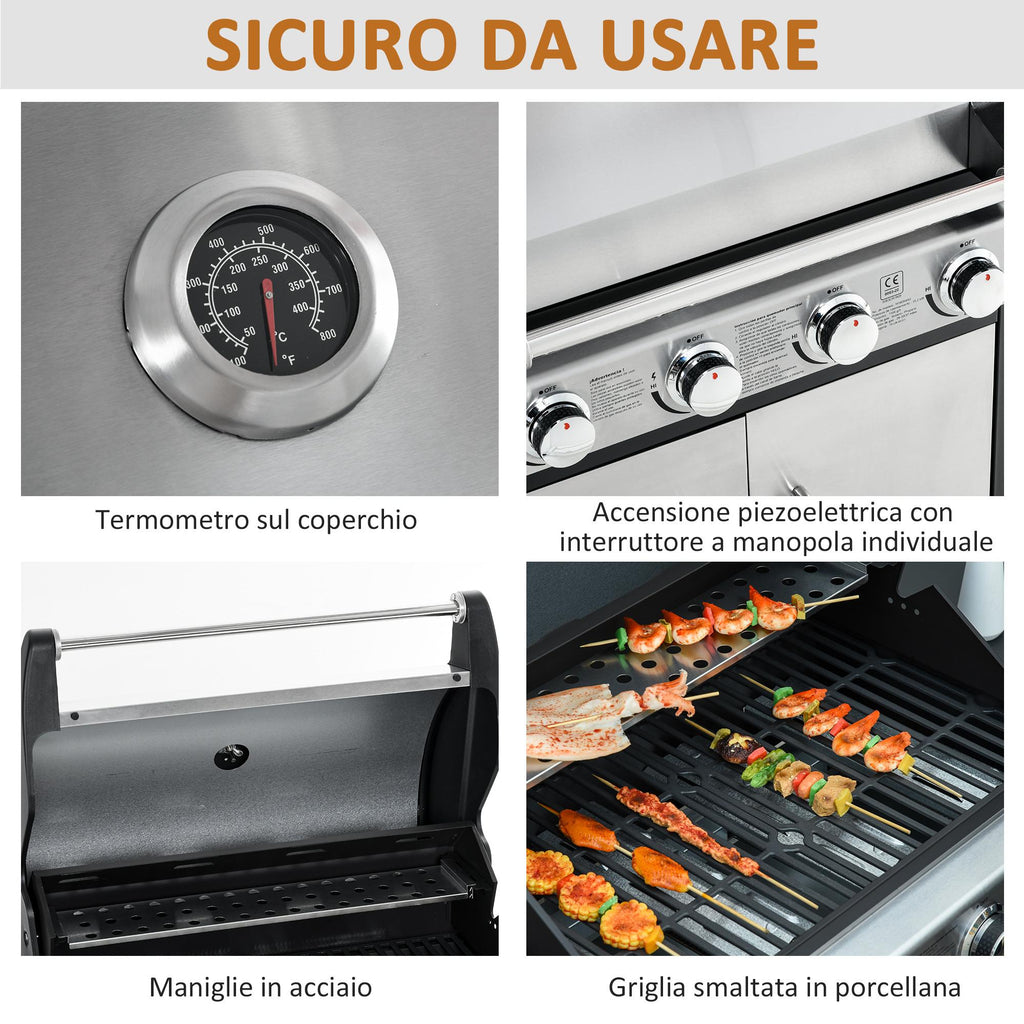 Barbecue a Gas 4 Fuochi + 1 Fornello Laterale 128x50x113 cm in Metallo e Acciaio Inox