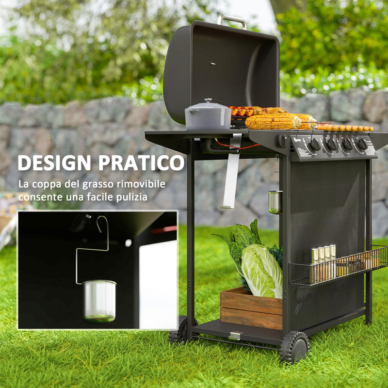 Barbecue a Gas con 4+1 Bruciatori Indipendenti 121x54x97 cm Coperchio con Termometro Nero