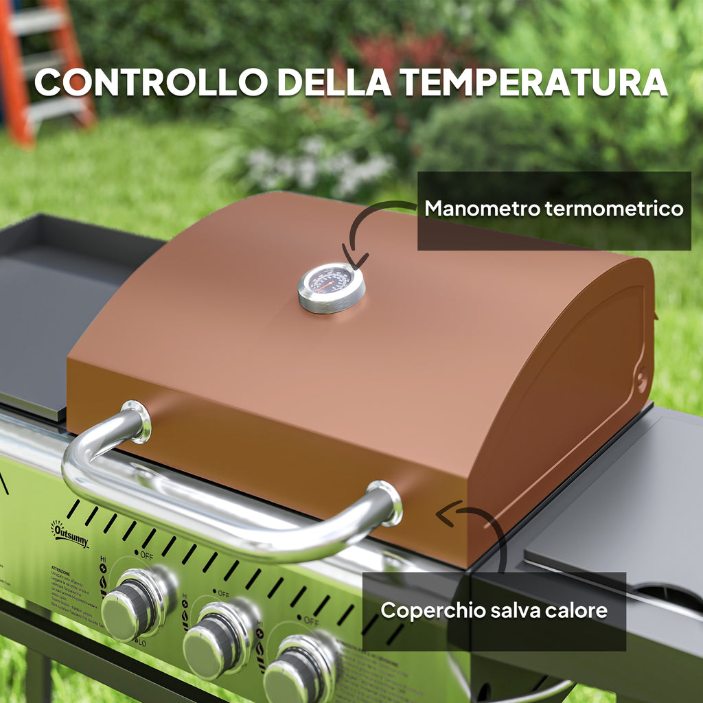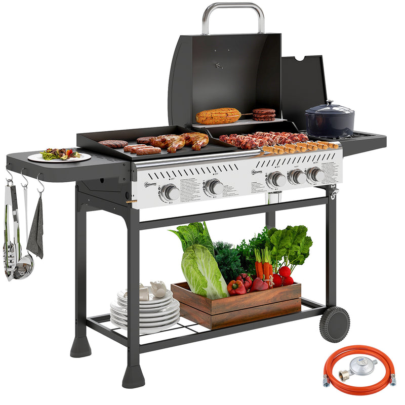 - BARBECUE DOPPIA FUNZIONE: Unisce una piastra e un barbecue a gas con fornello aggiuntivo, per preparare vari tipi di piatti in differenti modalità di cottura. Funziona a propano e dispone di cinque bruciatori autonomi, ognuno con controllo indipendente tramite accensione piezoelettrica
