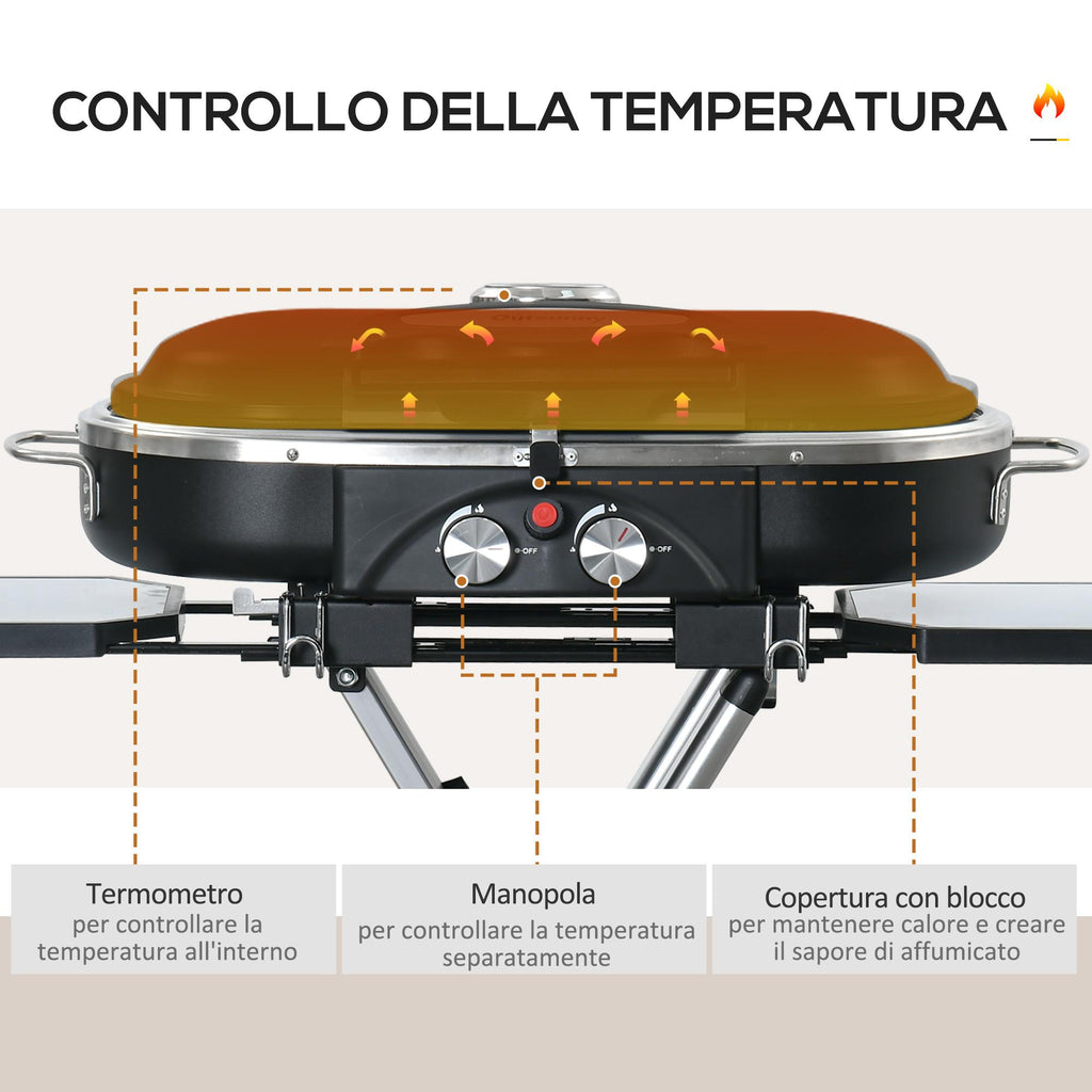 Lascia tutti a bocca aperta con questo barbecue a gas . I due bruciatori possono essere usati separatamente per grigliare le pietanze a temperature differenti, e grazie al termometro sul coperchio tieni d'occhio lo stato della cottura. I piani d'appoggio laterali e la tasca a rete sul fondo ti aiuteranno a tenere salse, vassoi e piatti a portata di mano. Finita la grigliata ripiega il BBQ e riponilo dove vuoi: occupa pochissimo spazio.