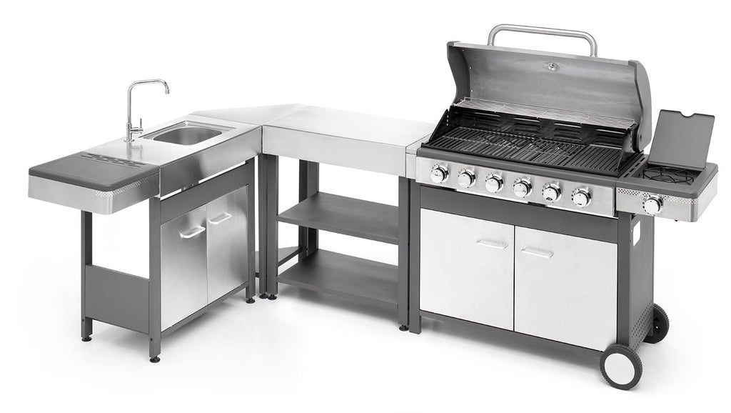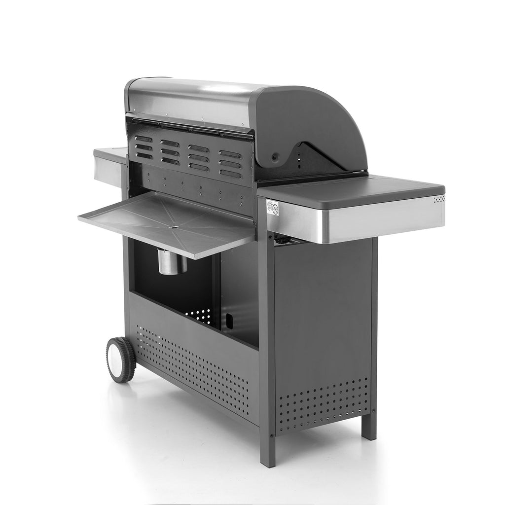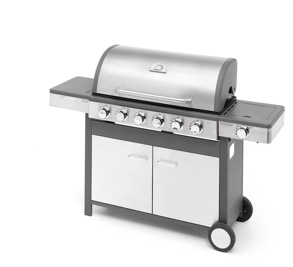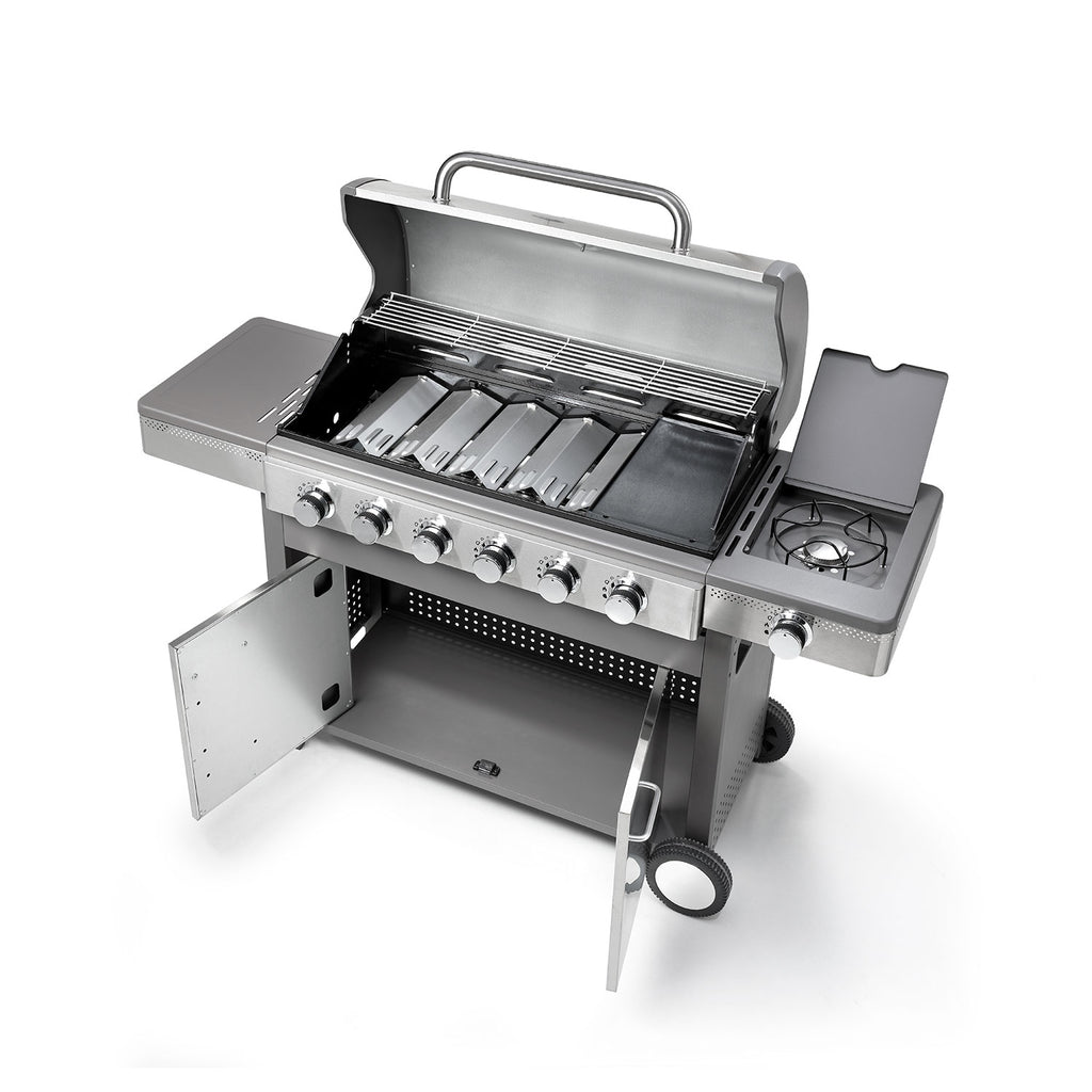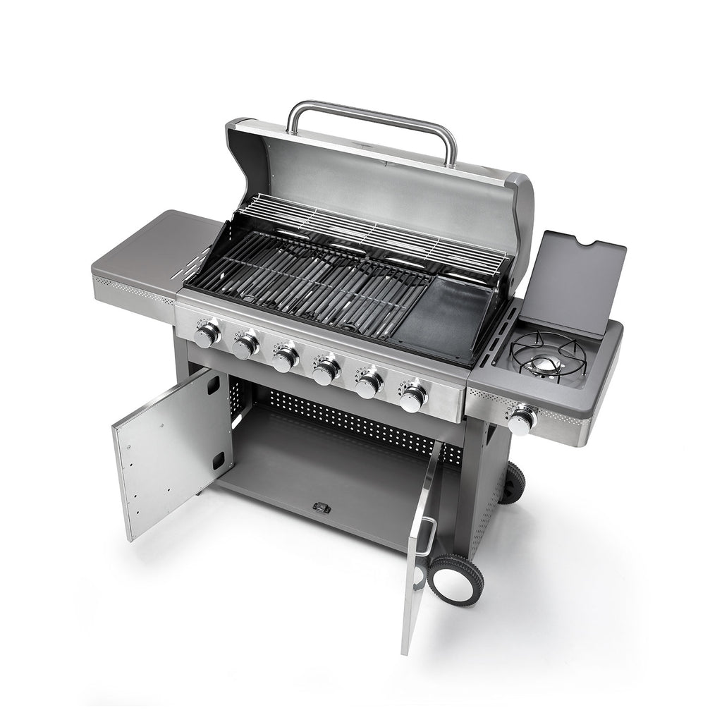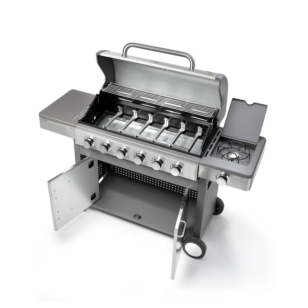 Camera di combustione in acciaio smaltato, coperchio completo di termometro, mensole laterali, pannello di controllo e porte armadietto in acciaio inox. Griglia riscalda vivande in acciaio Inox da 86x13 cm. N. 6 Bruciatori in acciaio inox a una rampa con sopra tegolino frangifiamma (6x3,6 kW). Robusto fornello laterale con coperchio richiudibile. Bruciatore in acciaio inox da 2,15 kW. Accensione elettronica. Coperchio in acciaio inox che consente la cottura a forno.
