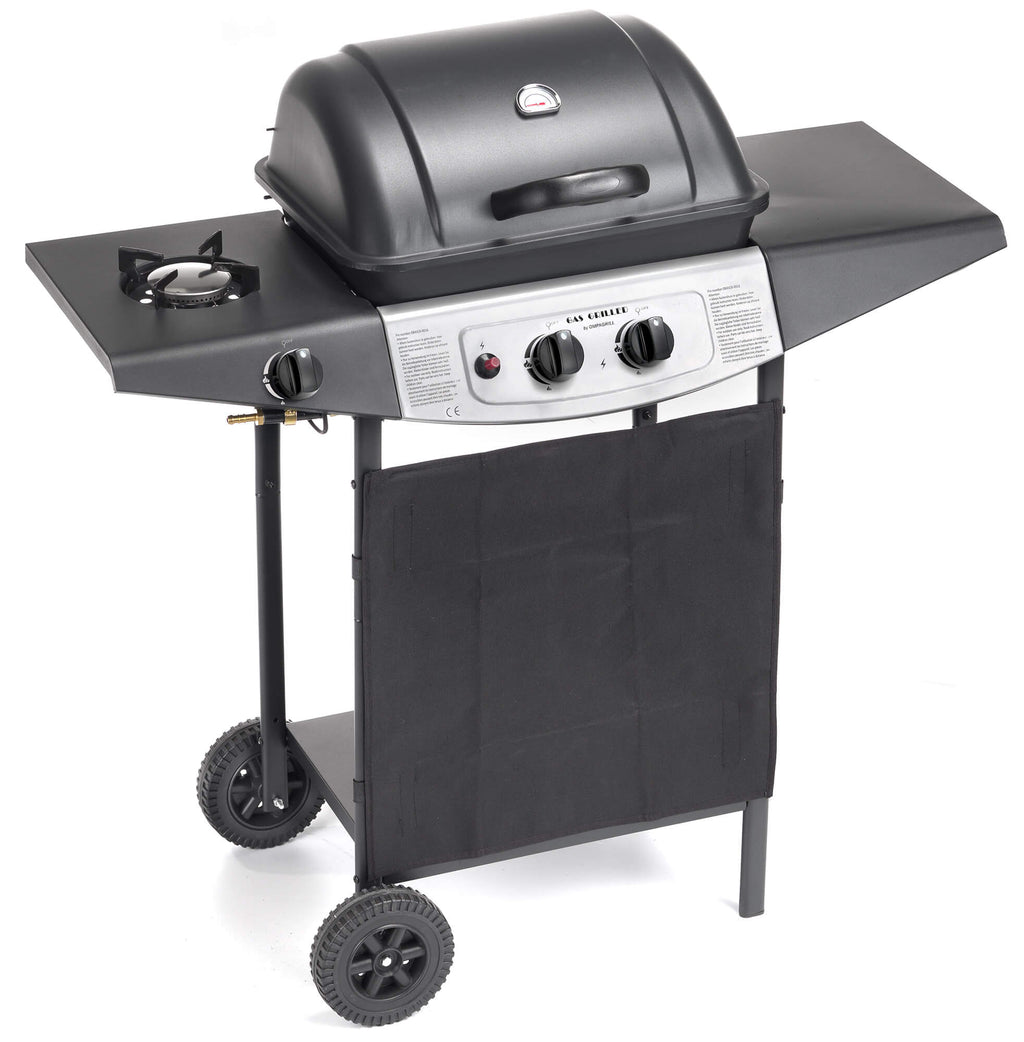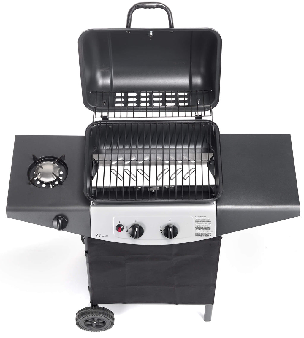 Barbecue Gas 4939 Double con Camera di combustione, coperchio completo di termometro, ripiano inferiore e mensole laterali in acciaio verniciato.