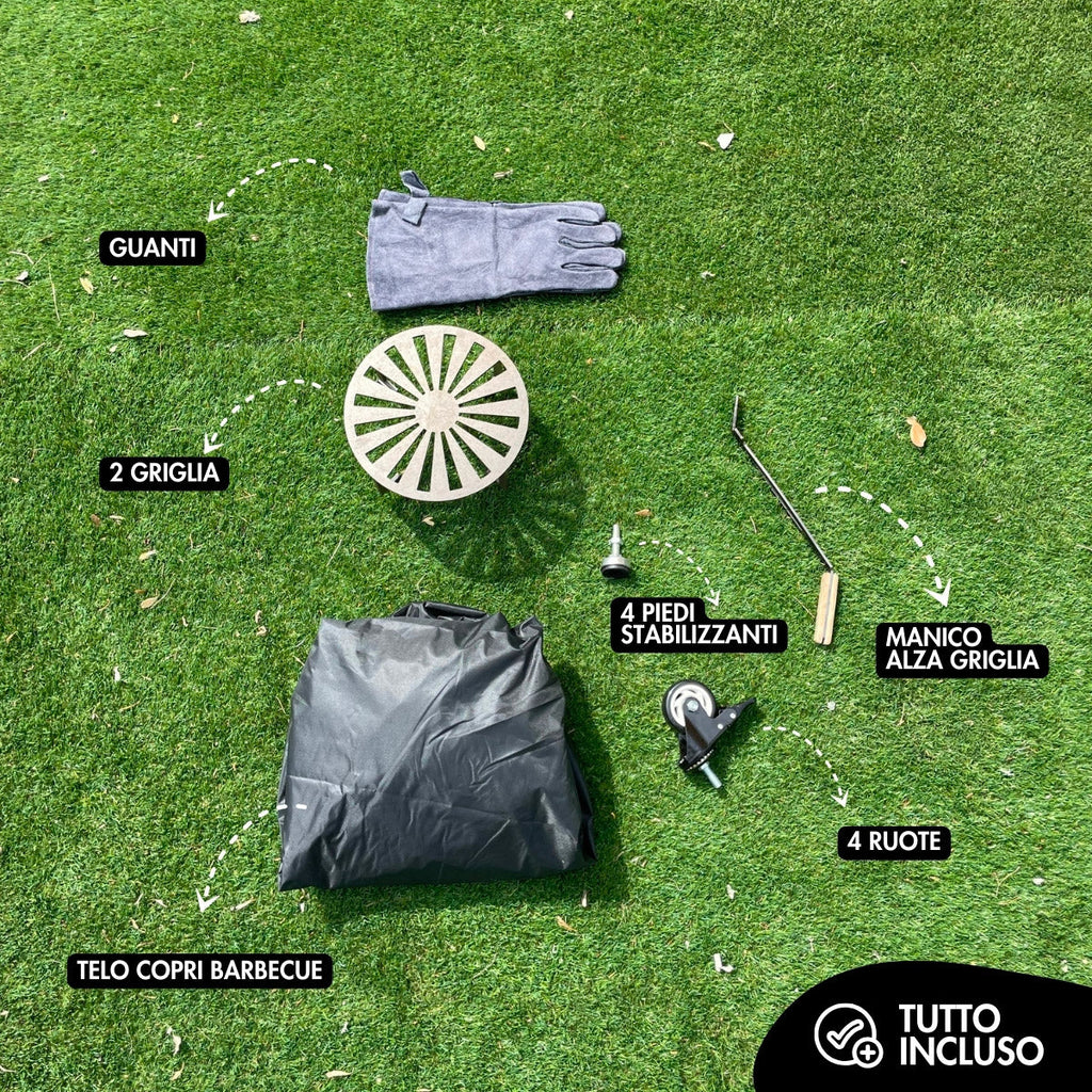 - ROBUSTO E RESISTENTE: Presenta una struttura robusta, peso 90Kg. Dotato di una doppia sezione di contenimento del calore, che impedisce alla fiamma di entrare in contatto con la struttura esterna del braciere, assicurandone la durevolezza nel tempo.
