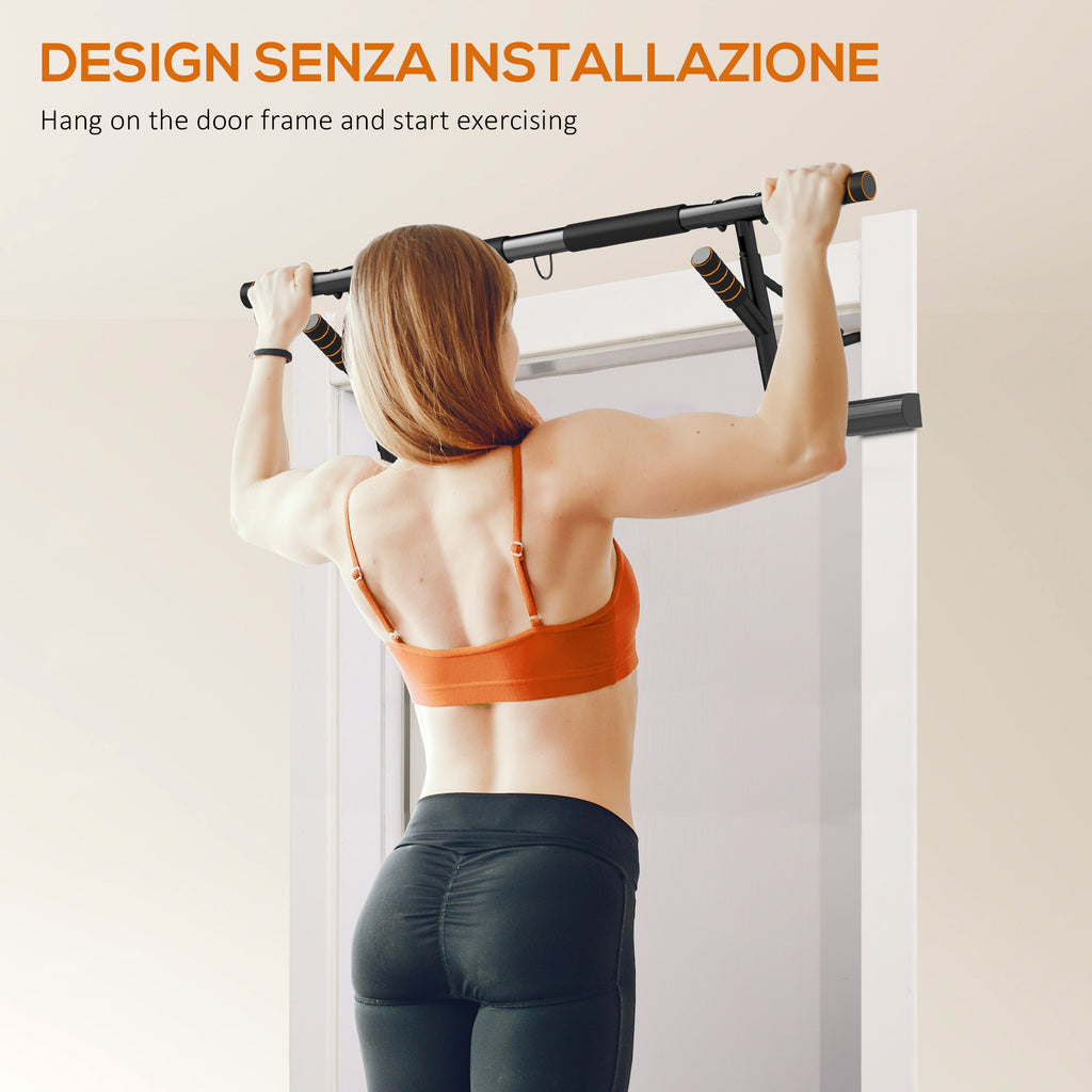 Il design senza installazione semplifica il montaggio su telai di porte adatti. La barra trazioni si adatta a telai di porte larghi 80-100 cm e a muri spessi 10-24 cm per garantire un'installazione sicura. La sbarra trazioni si monta sulla porta ma può anche essere messa a terra per fare flessioni. La struttura in acciaio al carbonio ad alta resistenza è in grado di supportare fino a 150 kg. La schiuma EVA antiscivolo sui manici della barra per flessioni migliora la presa e il comfort.