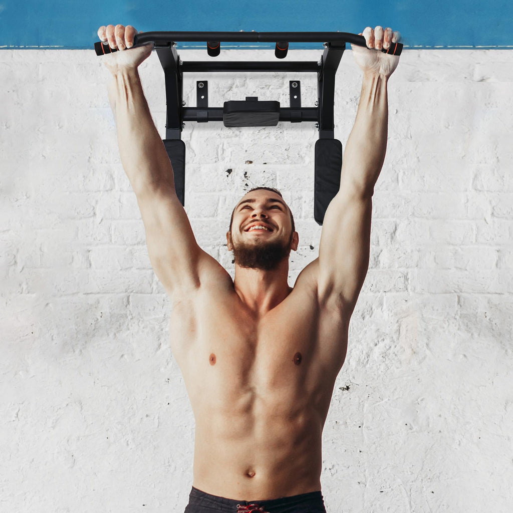- SICURO: La struttura di questa barra per trazioni è realizzata con tubi di acciaio riverniciato a polvere, progettati per sostenere fino a 120kg.