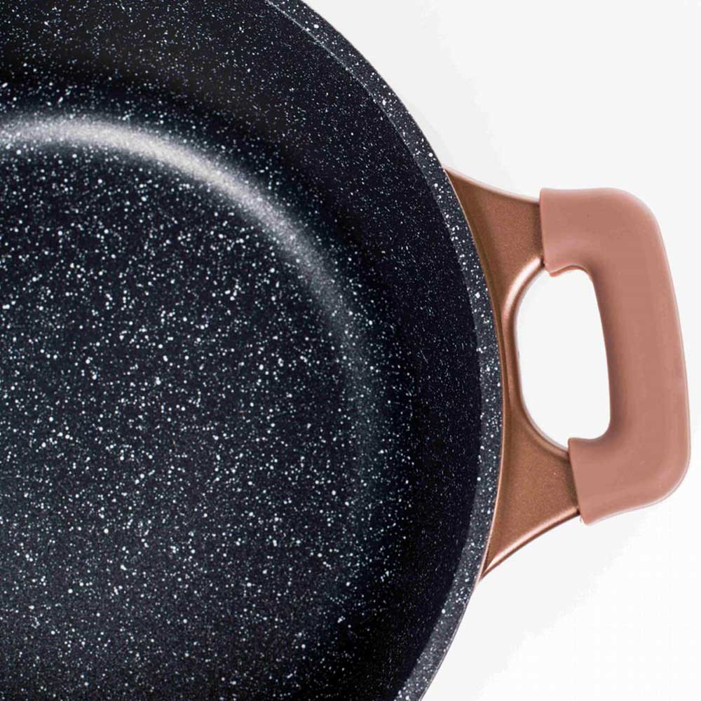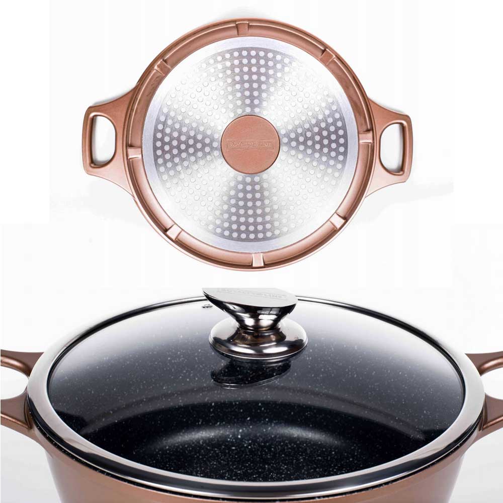 Set di pentole di qualità in colore rame, un set di pentole con superficie in marmo e greblon antiaderente.