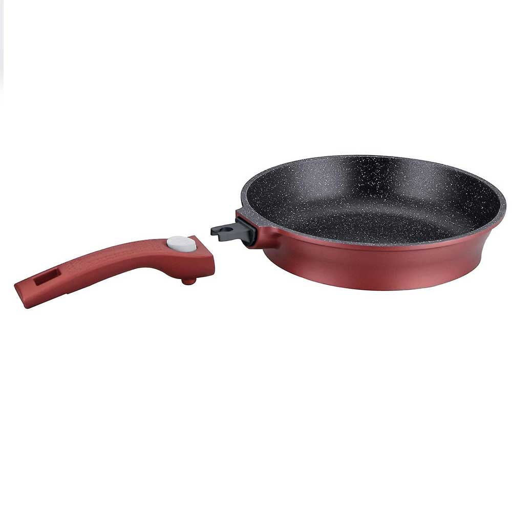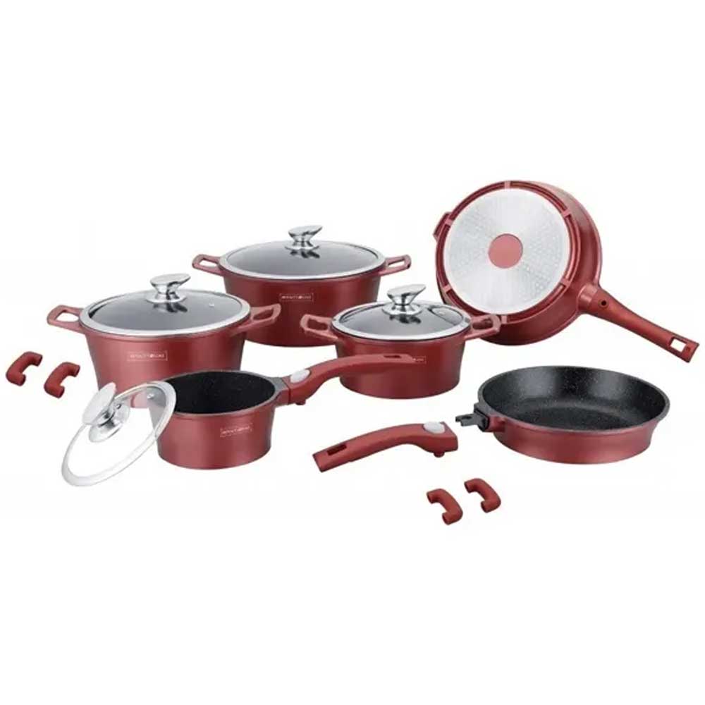 - 1x Batterie Pentole e Padelle da Cucina 14 Pezzi Antiaderente In Pietra Coperchio in Vetro Clip Maniglie Rimovibili Colore Borgogna