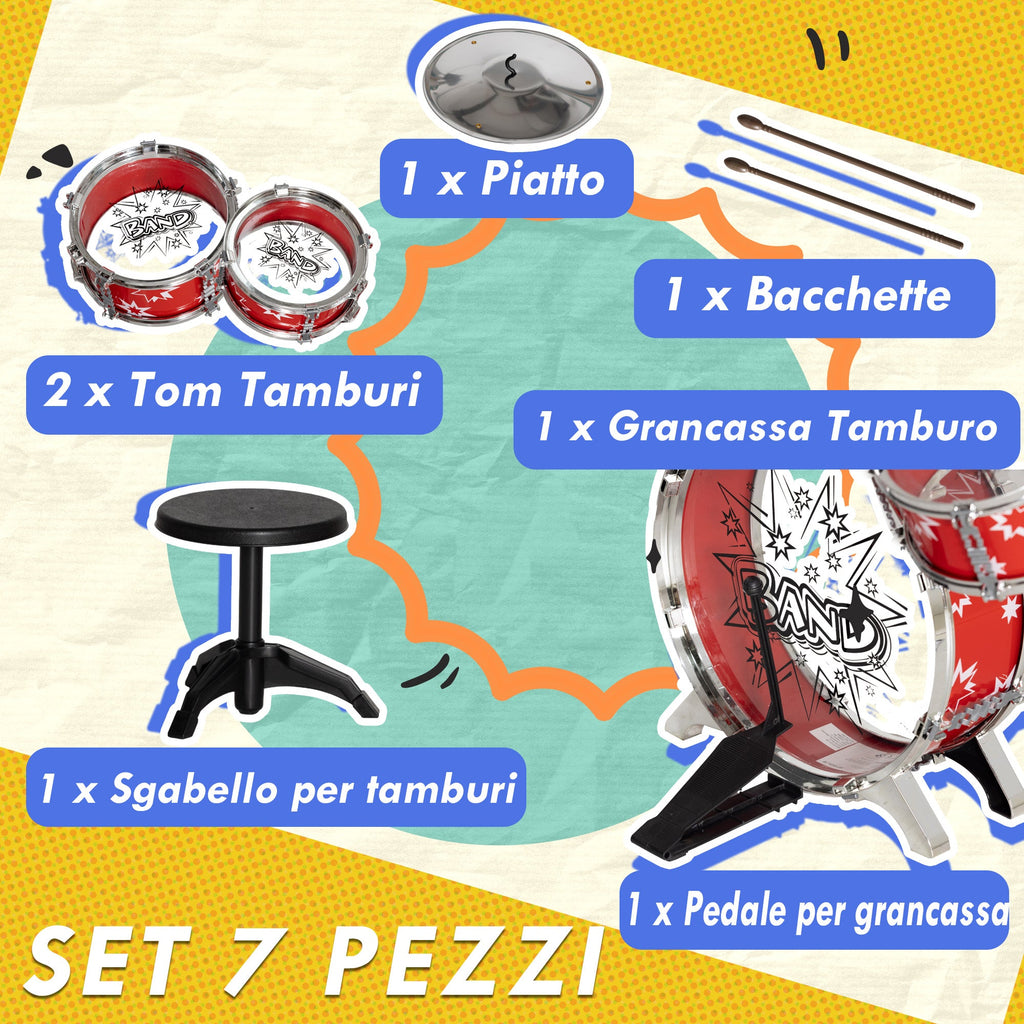 Batteria Musicale Giocattolo per Bambini Grancassa 2 Tamburi e Piatti con Bacchette e Sgabello Rosso
