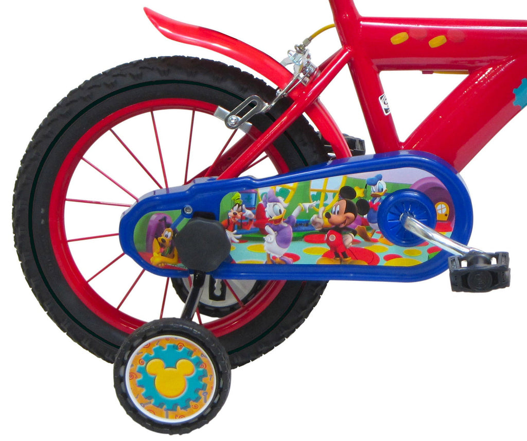 La bicicletta da 14 pollici bambino Mickey mouse è specificamente studiata per accompagnare i vostri figli nel mondo delle due ruote dai 3 ai 5 anni di età. La bicicletta 14 pollici è stabile e sicura grazie alle rotelle laterali removibili, agli pneumatici tassellati con camera d'aria e sicura grazie di freni anteriori e posteriori di tipo caliper. Con scudo anteriore personalizzato, con campanello sul manubrio e borraccia.