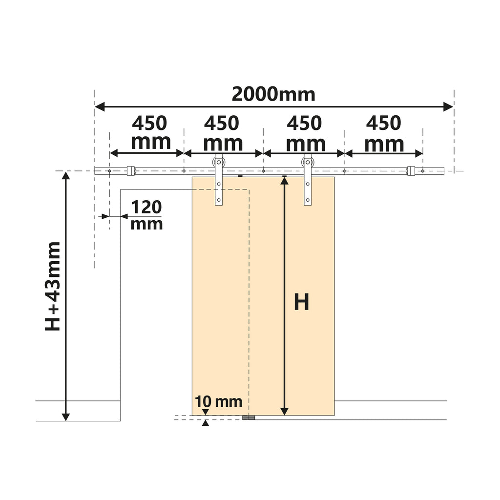 Il sistema è composto da un binario superiore di 2 metri, due carrelli per una porta, accessori anti-deragliamento e viti di installazione e fissaggio..