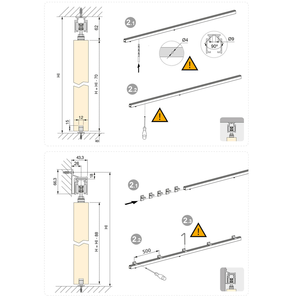 - Sistema scorrevole di porte sospese in legno per installazione a soffitto o parete con spessori da 18 a 40 mm.