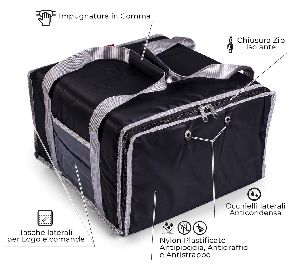 Borsa termica per pizze da asporto Made in Italy, realizzata in Nylon plastificato (antipioggia, antigraffio, antistrappo, resistente e facile da pulire) con comode maniglie per trasporto rinforzate con gommini. Occhielli laterali per la fuoriuscita della condensa. Dotata di chiusura a zip isolante e doppia tasca laterale trasparente, di cui una con grandezza A4 ideale per il logo della pizzeria. Può contenere un massimo di 6 pizze.