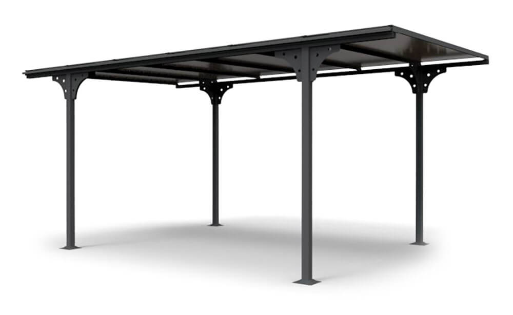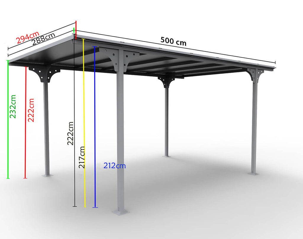 - Consegnato con 4 pali 70 x 70 mm, spess 1,4 mm, Struttura 50 x 50 mm, spess 1,4 mm, Piastre + perni ad espansione per calcestruzzo, 1 grondaia
