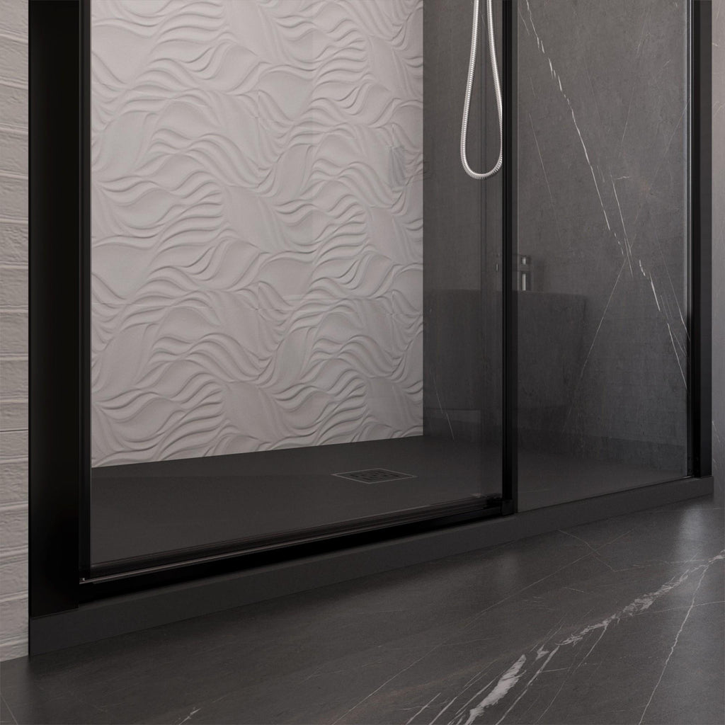 Box doccia a tre lati con profili neri, porta scorrevole dotato di chiusura magnetica per una perfetta tenuta dell'acqua, cristallo 6mm con trattamento anti calcare che evita le formazioni di calcare e facilita la pulizia permettendo la rimozione di impurità solo con acqua calda. Ti permette di Risparmiare non dovendo più comprare prodotti specifici. Installabile a filo pavimento o su piatto doccia. Rotelle in acciaio inox e teflon