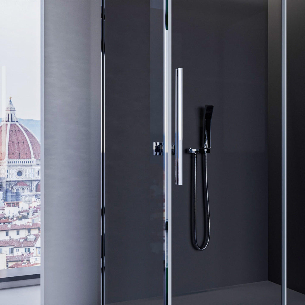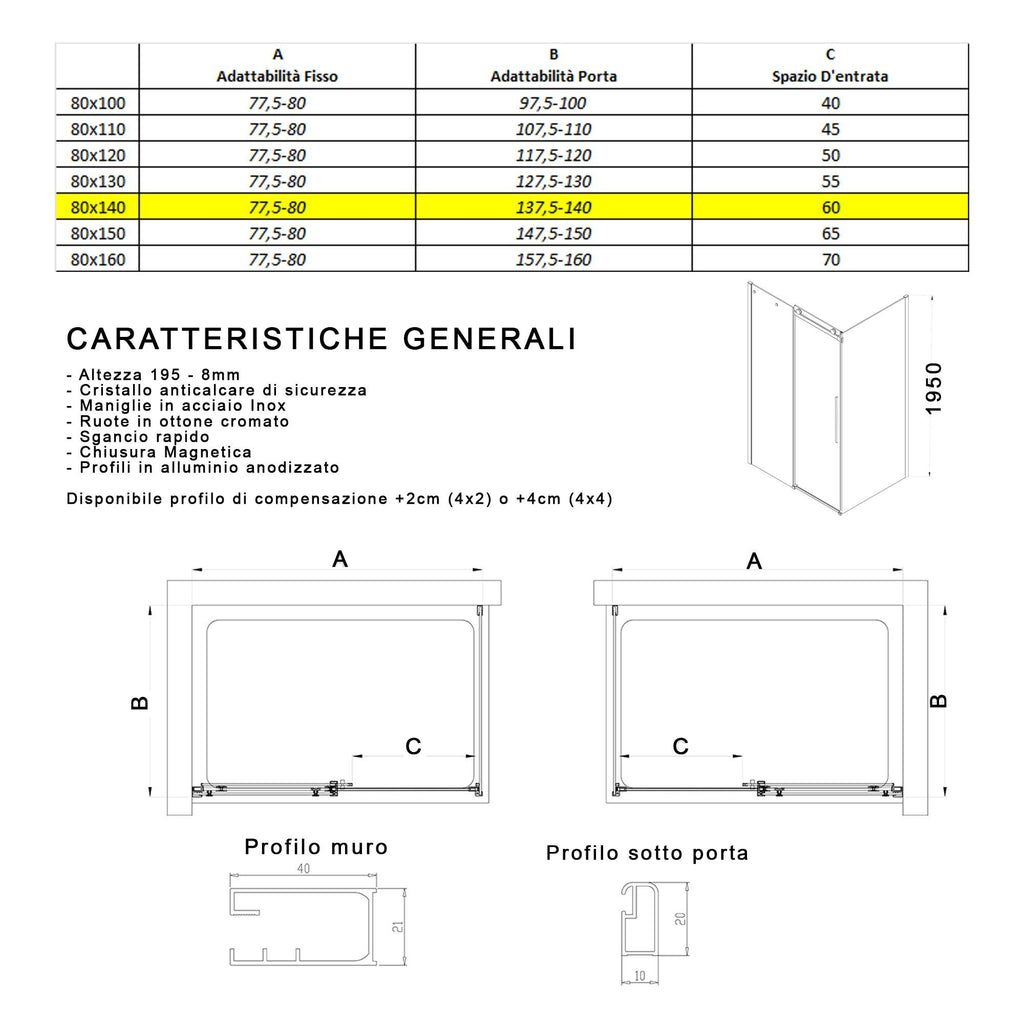 Box doccia due lati h195 con porta scorrevole e lato fisso, la perfezione assoluta si ritrova nei dettagli di questo meraviglioso prodotto. Maniglia in acciaio inox da 50cm dona alla porta quel tocco di estetica pura e minimalista. Chiusura magnetica con magnete di chiusura posto all'interno di un elegante profilo di alluminio che ne preserva a vita l'integrità. Anticalcare interno esterno per preservare ed evitare formazioni di calcare permanente.