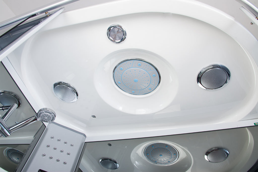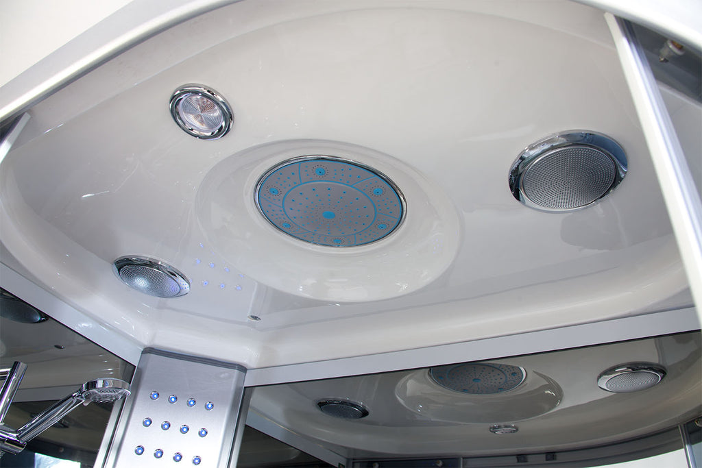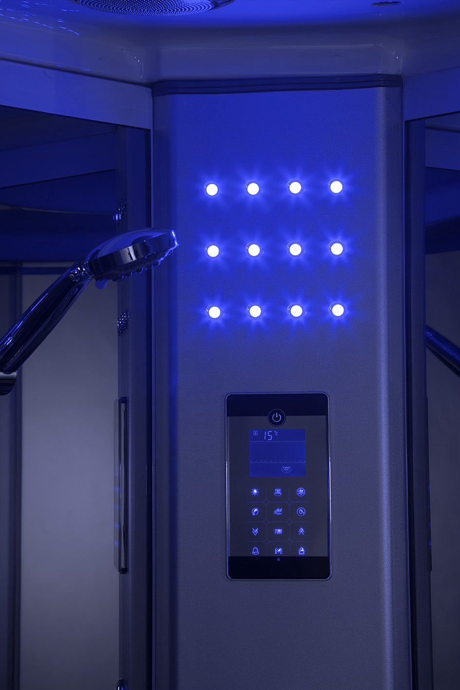 Profili portanti in Alluminio, illuminazione interna a led, aspiratore di vapore, radio, ricevitore telefonico, soffione centrale, saliscendi, 6 potenti getti idromassaggio orientabili per spalle e schiena regolabili, massaggio piedi, pannello digitale touch screen, appoggia flaconi.