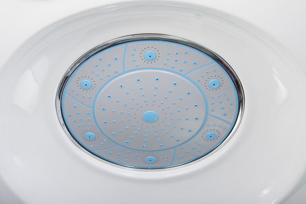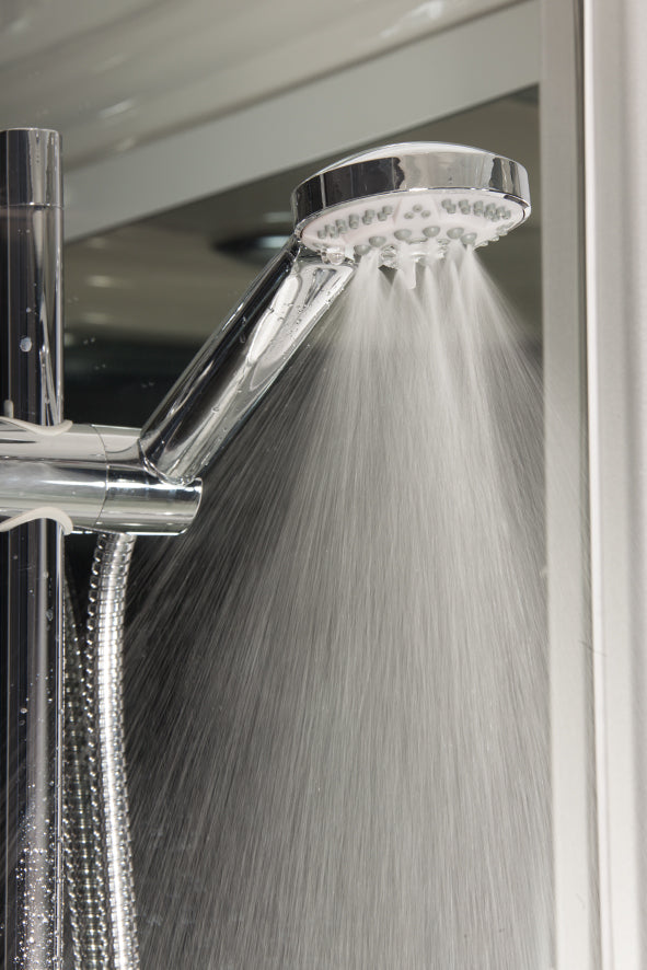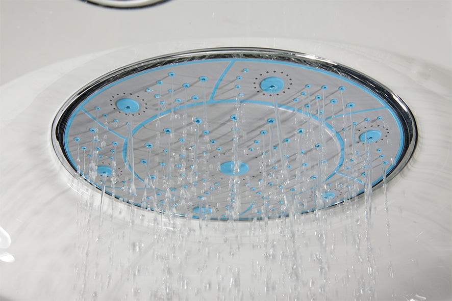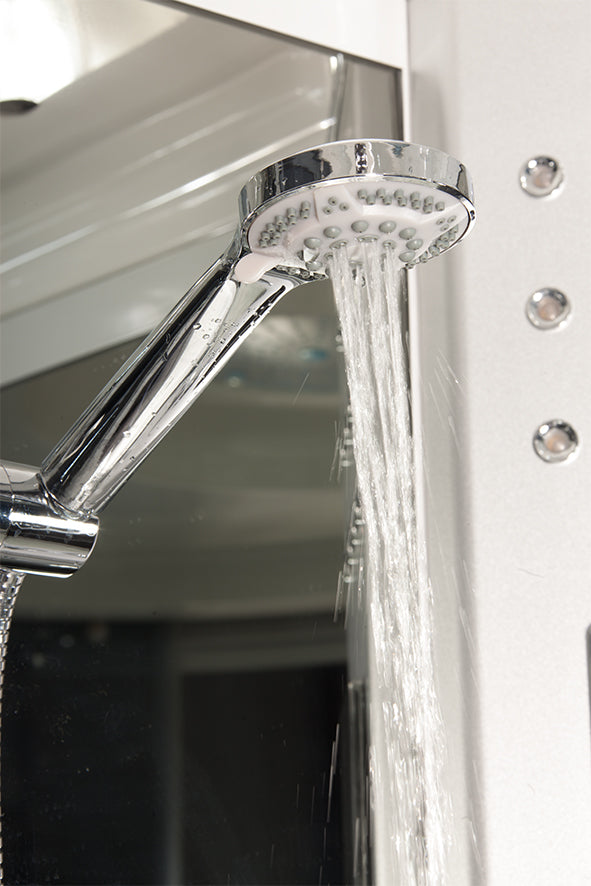Profili portanti in Alluminio, illuminazione interna a led, aspiratore di vapore, radio, ricevitore telefonico, soffione centrale, saliscendi, 6 getti idromassaggio per spalle e schiena, regolazione dei getti, display touch screen per impostare tutte le funzioni preferite della doccia, appoggia flaconi per bagno schiuma e massaggio plantare.