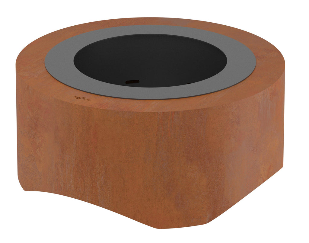 Un Braciere composto da un involucro in acciaio con rivestimento Corten dal colore rossastro e un solido inserto in acciaio nero. L'acciaio corten, abbreviazione dei termini inglesi che definiscono le caratteristiche principali, CORrosion restistance (resistenza alla corrosione) e TENsile strength (resistenza a trazione), è un materiale a basso contenuto di lega.