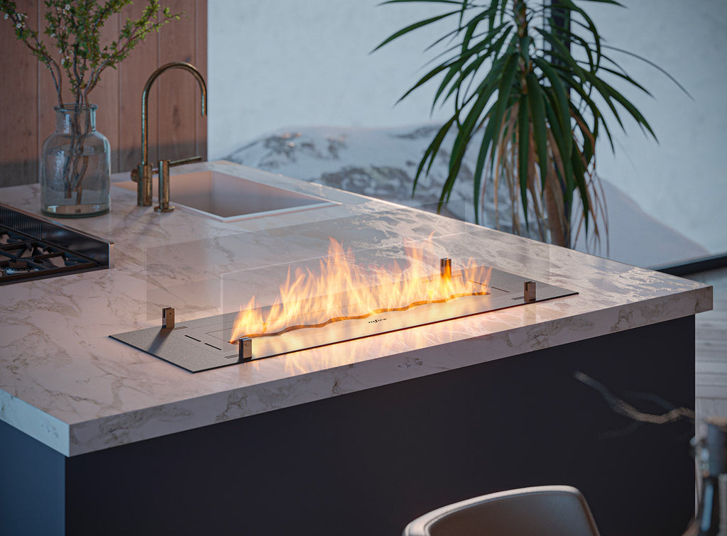 L'inserto in fibra ceramica insieme alla rete aumenta la sicurezza, oltre a prolungare e ottimizzare il processo di combustione. La barra scorrevole consente di regolare la dimensione della fiamma e spegnere il camino in sicurezza, e la forma dell'onda crea un ulteriore effetto 3D.