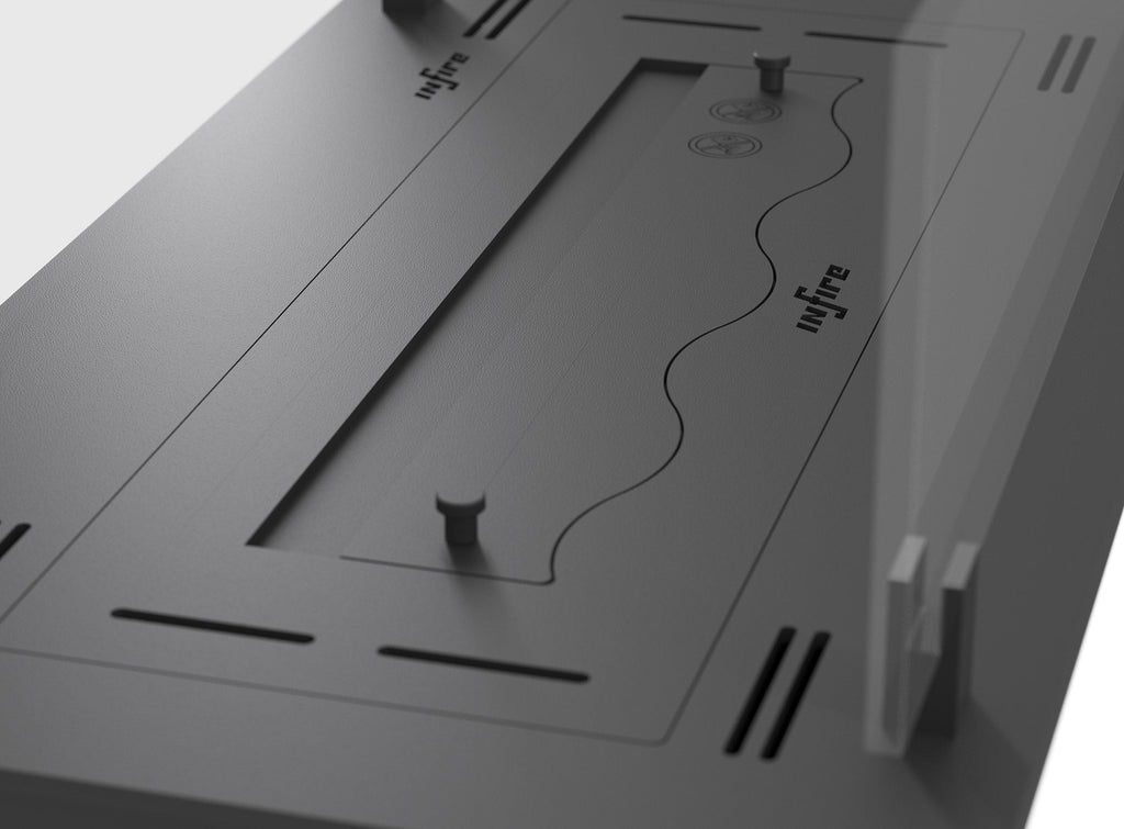 L'inserto in fibra ceramica insieme alla rete aumenta la sicurezza, oltre a prolungare e ottimizzare il processo di combustione. La barra scorrevole consente di regolare la dimensione della fiamma e spegnere il camino in sicurezza, e la forma dell'onda crea un ulteriore effetto 3D.