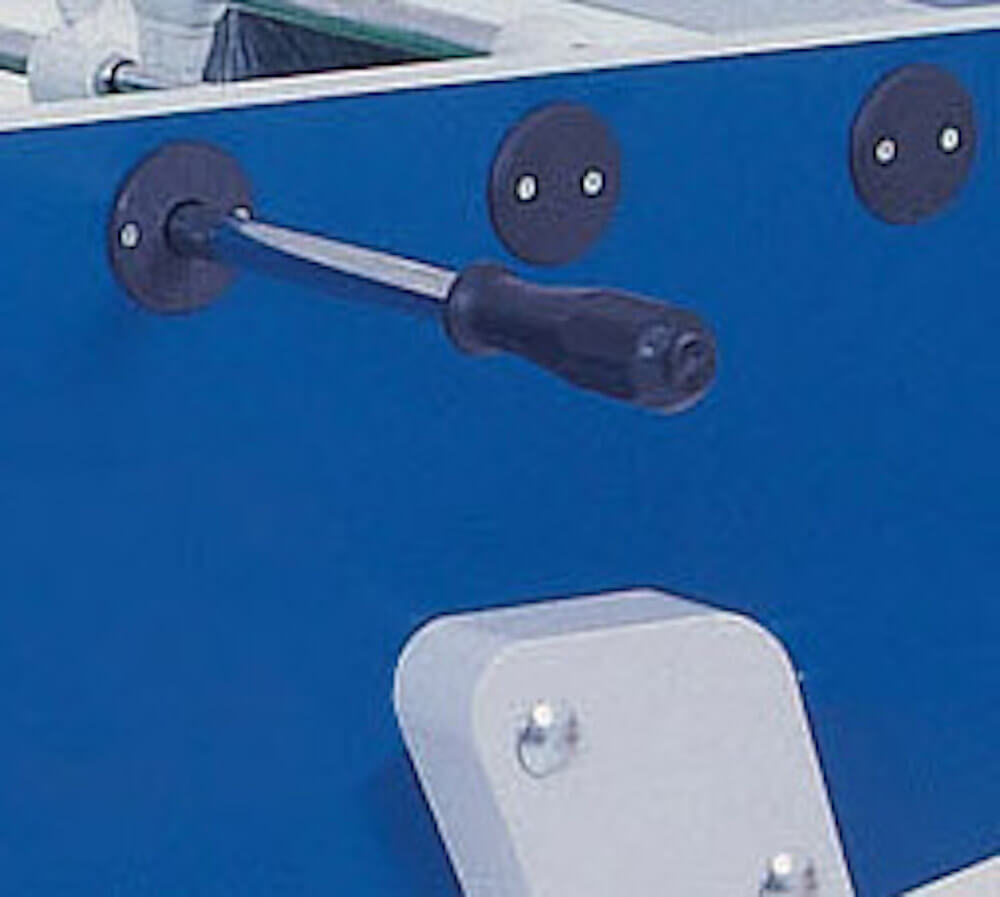 La copertina impermeabile fornita con il calciobalilla protegge i colori, mentre i piedini regolabili regolabili di serie ne permettono la collocazione anche su terreni irregolari.