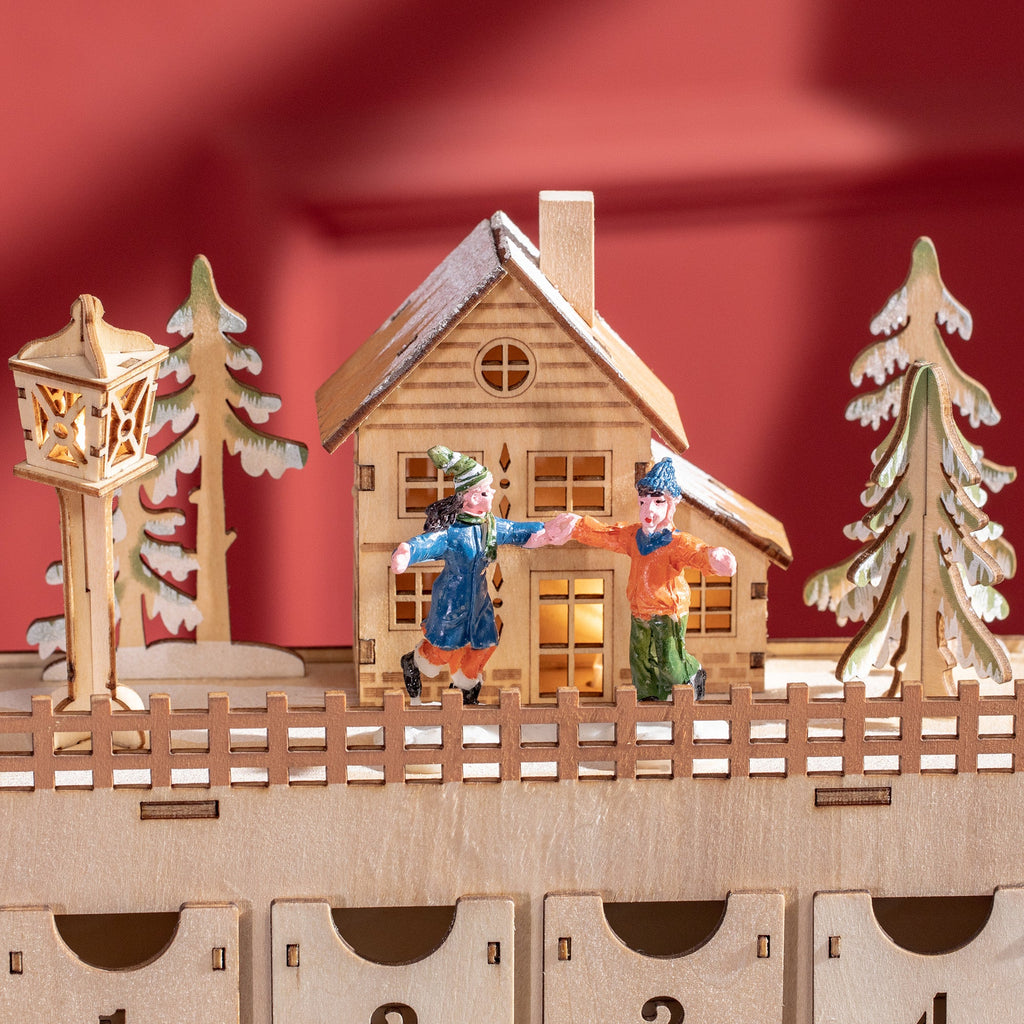 Calendario Avvento di Natale 22x9x30 cm con 12 Luci a LED in Compensato Arancione