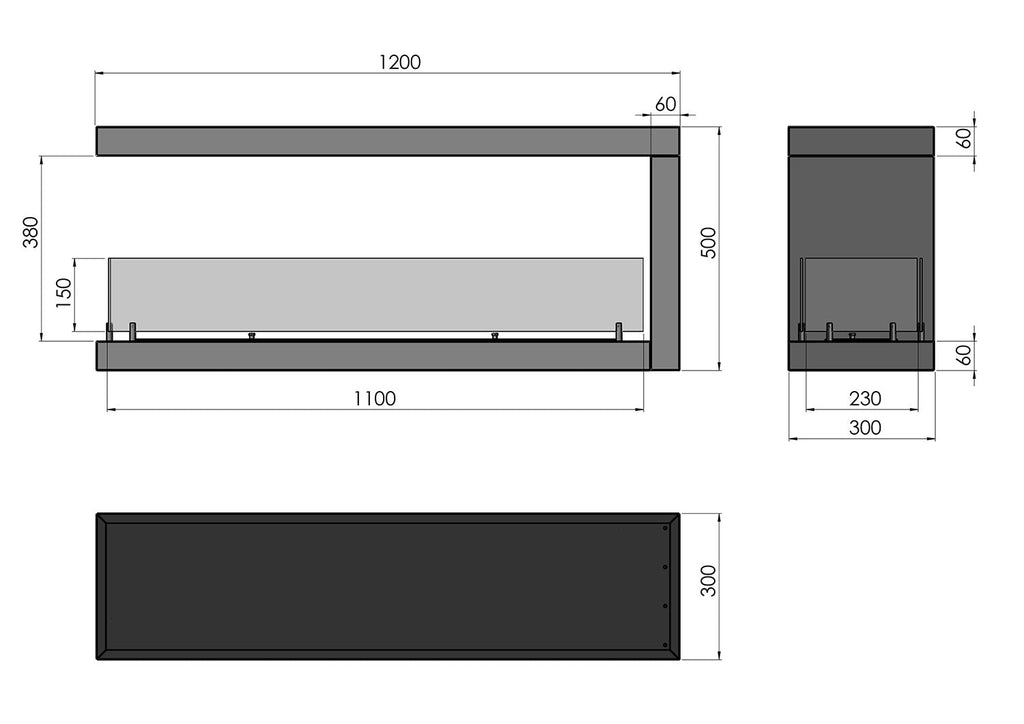 Camino a Bioetanolo Trifacciale da Incasso 3 lati 120x50x30 cm INSIDE U1200.2 Nero con Vetro
