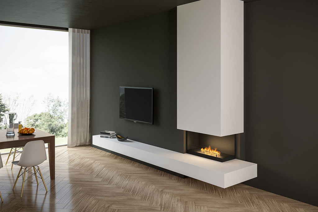 Un Biocamino ad Angolo orizzontale e aperto sul lato destro è la soluzione ideale per la costruzione in un angolo della casa.