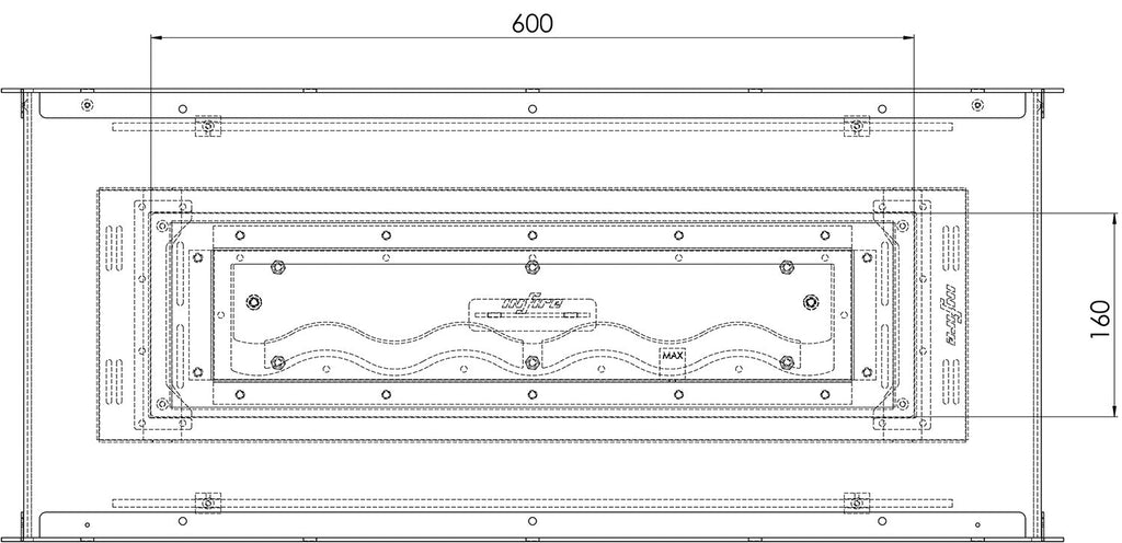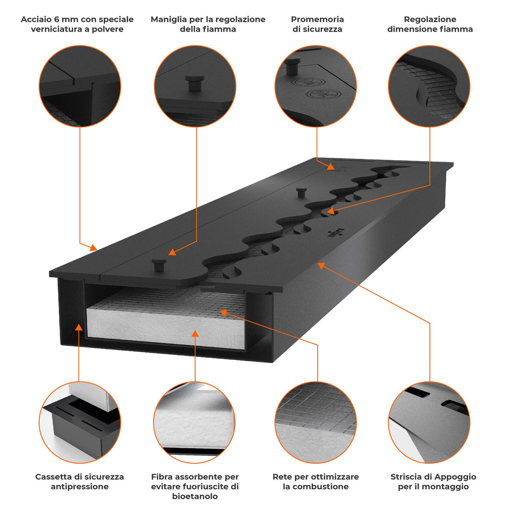 Un inserto in fibra ceramica con rete aumenta la sicurezza, prolunga e ottimizza il processo di combustione. La striscia scorrevole consente di regolare la dimensione della fiamma e spegnere il camino in sicurezza , mentre la forma ad onda crea un ulteriore effetto 3D.