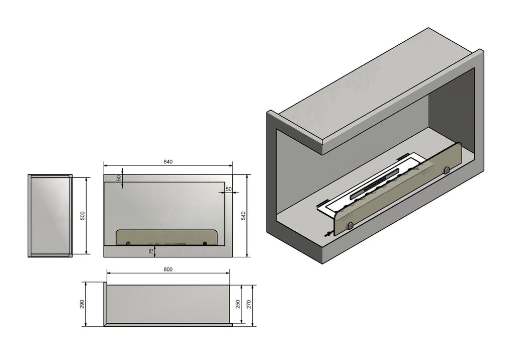 Caratteristiche Tecniche Camino a Bioetanolo da Incasso 84x54x29 cm Inside L800 V1 Angolo a Sinistra Nero con Vetro