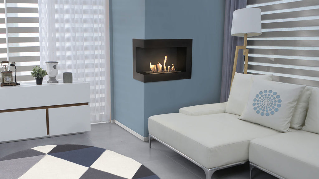 Un Biocamino ad Angolo orizzontale e aperto sul lato destro è la soluzione ideale per la costruzione in un angolo della casa.