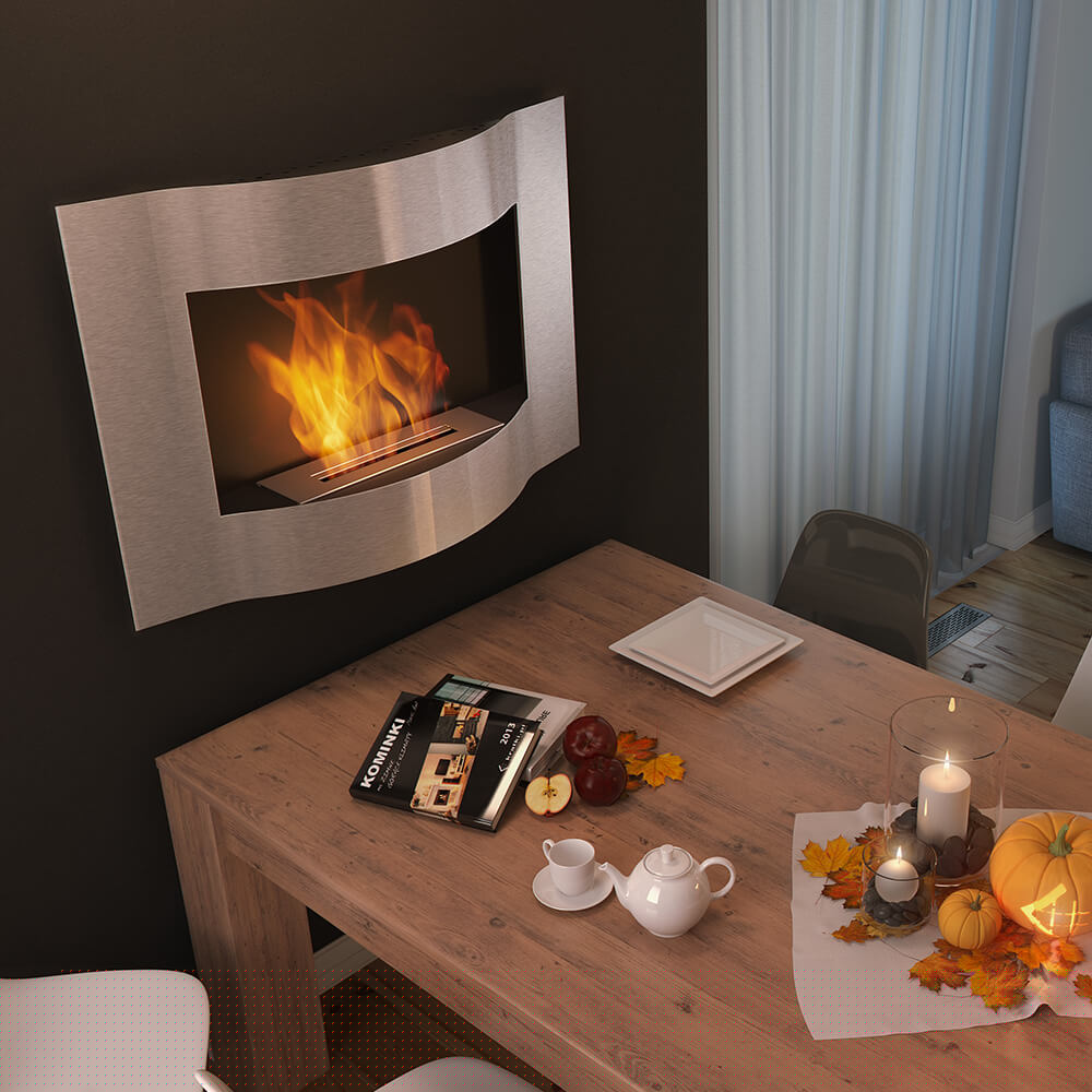 Caminetto a bioetanolo da parete o da incasso. Facile da installare, è possibile montarlo in due modi: incassato nel muro dentro un apposita nicchia, oppure appeso come un quadro tramite gli appositi tasselli. Il suo design lo rende adatto a qualsiasi ambiente. Aggiungendo al bioetanolo qualche goccia di essenza profumata, il biocamino può essere utilizzato anche come diffusore di aromi.