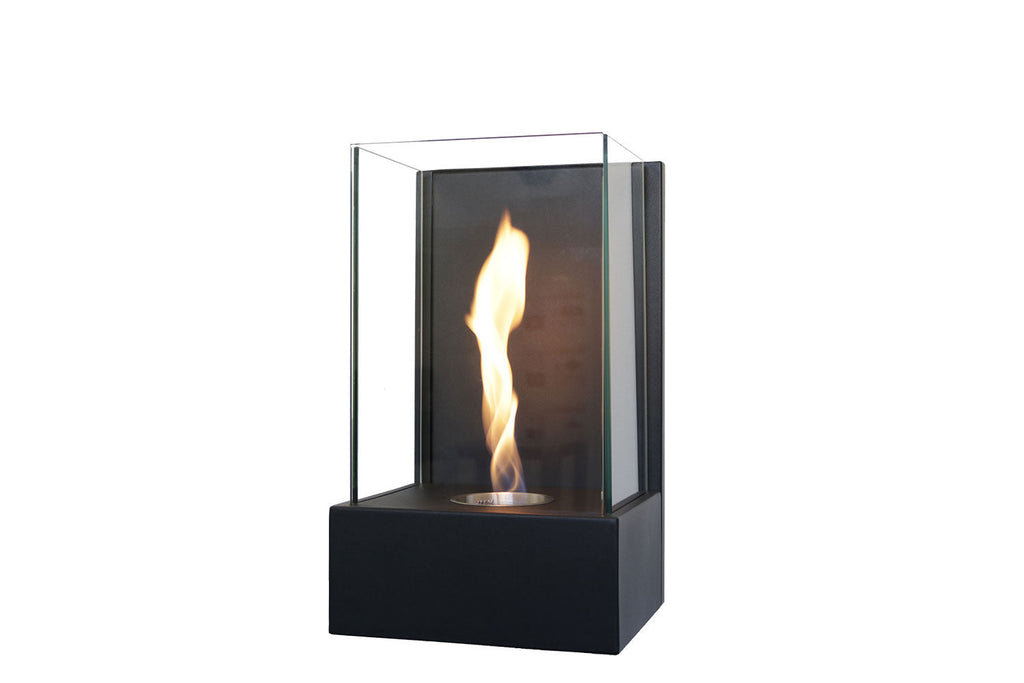 Camino a bioetanolo da parete o posizionabile sul tavolo, struttura in acciaio verniciato nero con 3 vetri di protezione. Dotato di bruciatore removibile con fibra e coperchio di chiusura fiamma. Installazione semplice che non richiede canna fumaria e allacciamento elettrico. Certificato secondo la normativa EN 16647:2016.