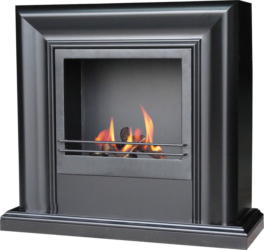 Caminetto ecologico con mantello di legno Nero lavorato. Non necessita di canna fumaria ed è dotato di 3 bruciatori che sviluppano una potenza massima di 3,5 kw/h. Corredato di 3 tronchetti ceramici ignifughi.