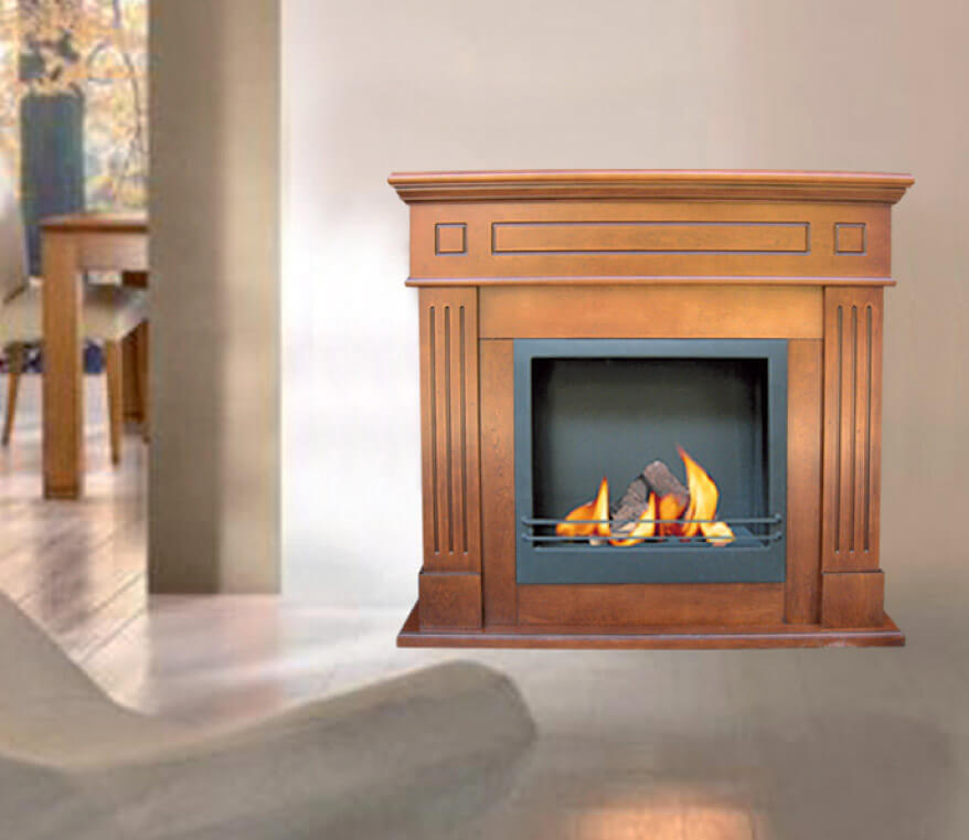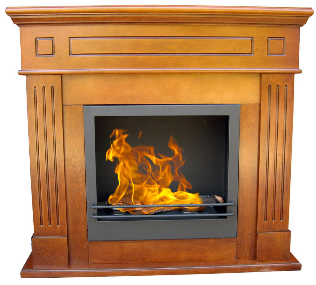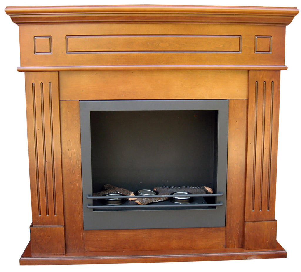 Caminetto ecologico con mantello con mantello in legno noce anticata. Non necessita di canna fumaria ed è dotato di 3 bruciatori da 340 ml cad, che sviluppano una potenza massima di 3,5 kw/h. Corredato di 3 tronchetti ceramici ignifughi.