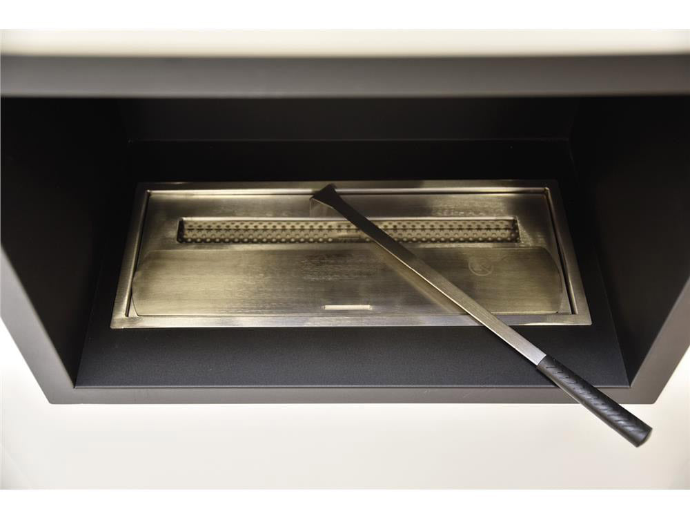 L'apertura del serbatoio si regola con agilità grazie all'innovativo design ad angoli arrotondati che permette alla serranda di scorrere dall'alto verso il basso senza intoppi. Braccio metallico in dotazione con il biocamino per consentire la manovra di apertura del bruciatore.