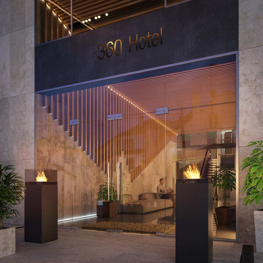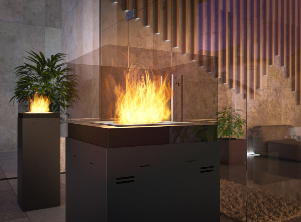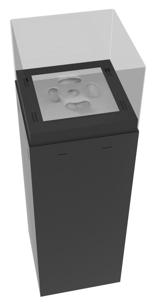 Instate 1150 è la forma più alta del camino Instate 850 Il biocamino ha la forma di un pilastro geometrico con focolare e vetro di sicurezza. Sarà perfetto non solo all'interno, ma anche all'esterno (es. su terrazze, balconi o all'ingresso di palazzi o edifici).