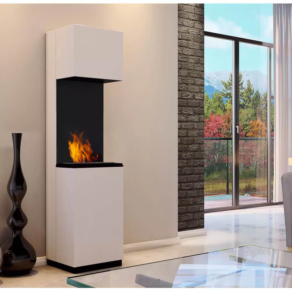 Caminetto a bioetanolo da pavimento a colonna. Facile da installare, i biocamini da pavimento sono spostabili e adatti a qualsiasi ambiente.