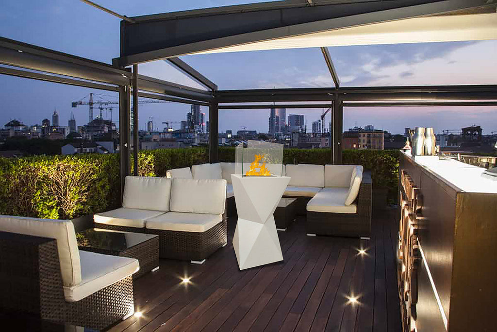 Camino a bioetanolo a libera installazione, composto da una struttura portante centrale, 4 vetri protettivi termoresistenti, un bruciatore da 2,7 litri e uno spegnifiamma. Il corpo principale è in acciaio inossidabile verniciato di bianco. Il bruciatore è certificato e circondato da 4 vetri a protezione della fiamma, resistenti al calore. La fiamma prodotta ha una lunghezza di oltre 22 cm. Il camino Diamond trova la sua perfetta ubicazione sia per gli interni che in dehors, terrazze, patios e giardini. La forma particolare, che ricorda un diamante, lo rende molto appropriato a locali e ristoranti nonché giardini privati. Dona all’ambiente un tocco elegante e modaiolo.