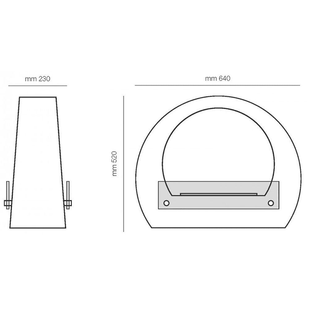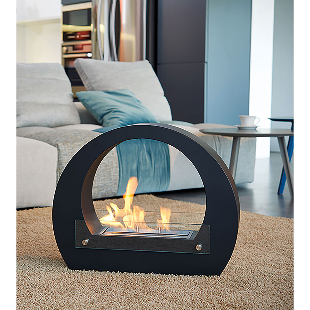 Camino a bioetanolo da pavimento, dalla forma a mezzaluna elegante con struttura in acciaio verniciato e dotato di 2 vetri temperati di protezione. Dotato di bruciatore removibile con fibra e coperchio di chiusura fiamma. Installazione semplice che non richiede canna fumaria e allacciamento elettrico. Certificato secondo la normativa EN 16647:2016.