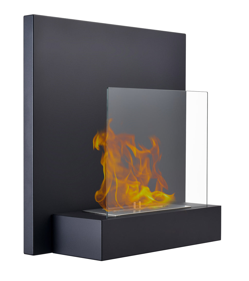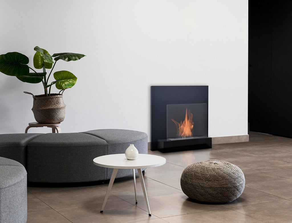 Camino a bioetanolo con bruciatore da 1,2 lt, certificato EN16647, con lana di roccia. In acciaio verniciato nero, resistente al calore. Vetro temperato a protezione della fiamma.