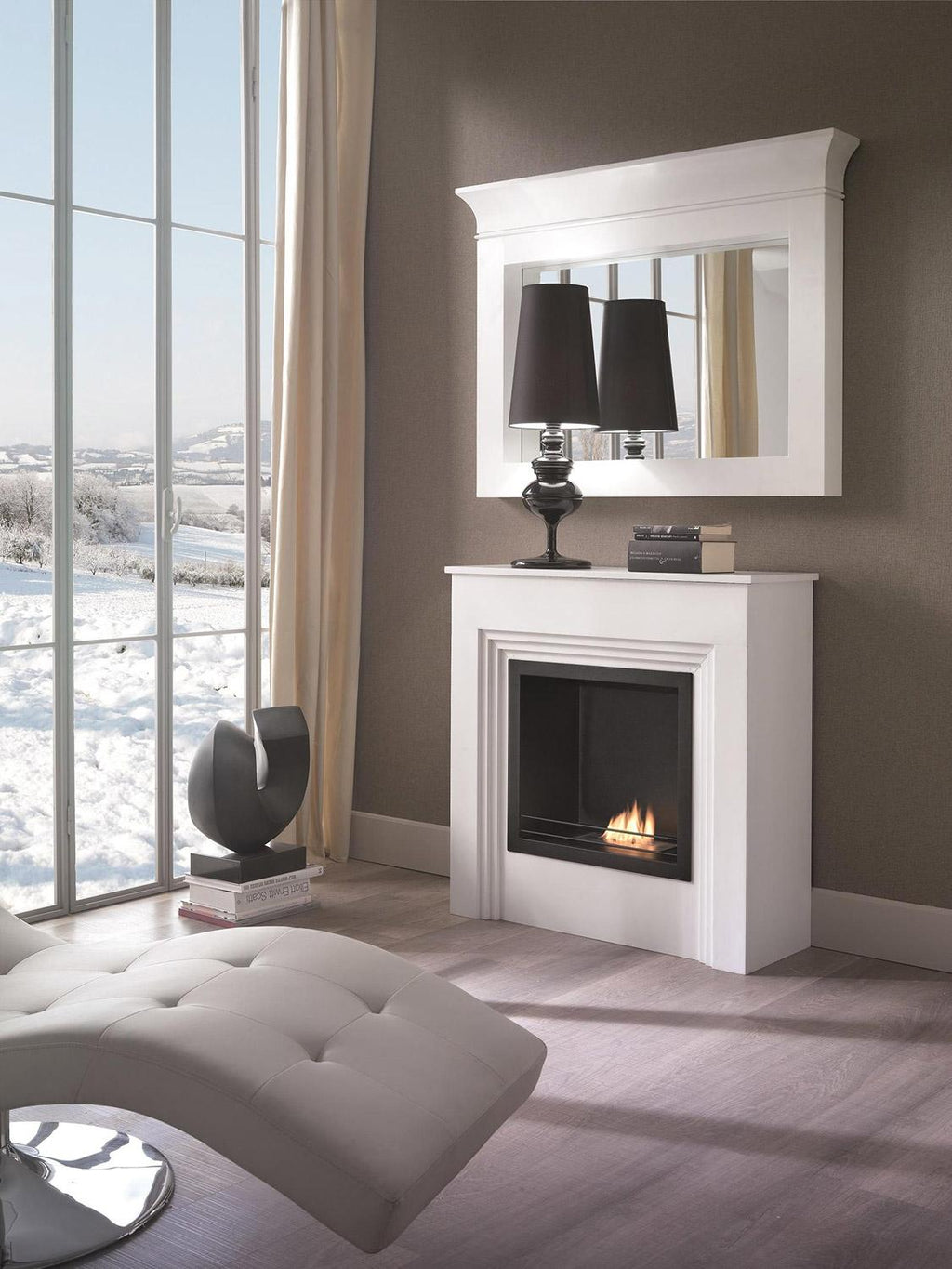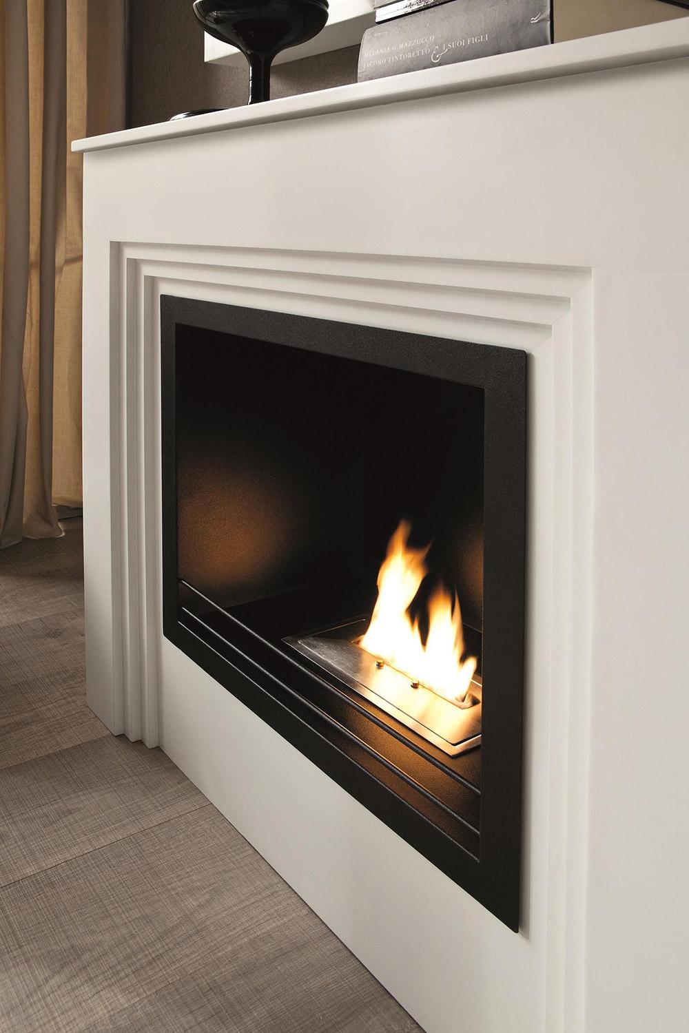 Caminetto con struttura in MDF verniciato bianco opaco.