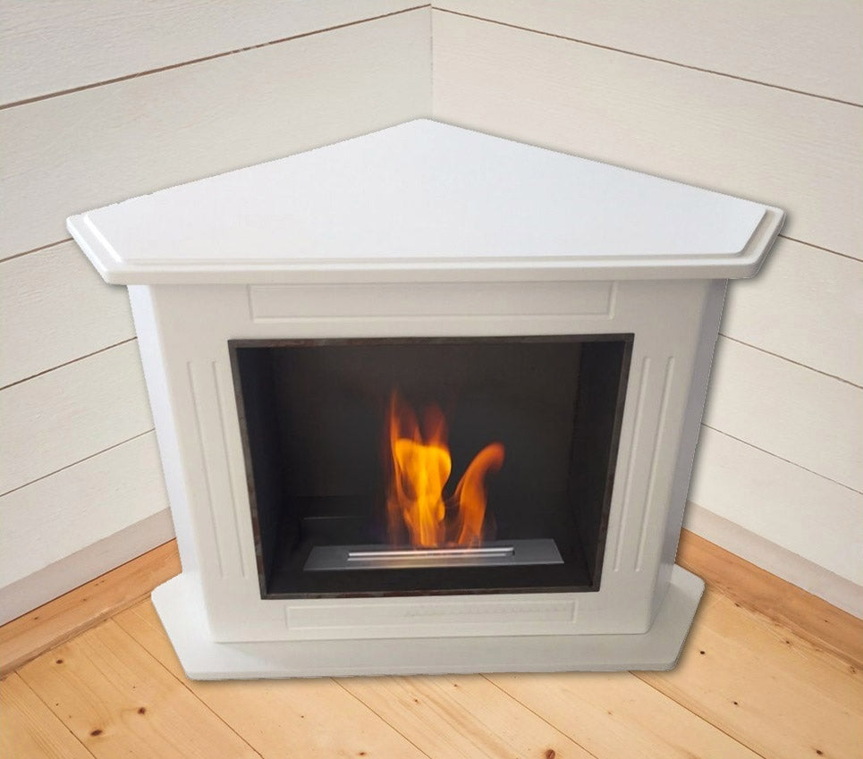 Camino a Bioetanolo ecologico Angolare con mantello in legno bianco lavorato. Dotato di un bruciatore da 1,7 lt con doppio fondo e lana di roccia, certificato UNI EN16647.