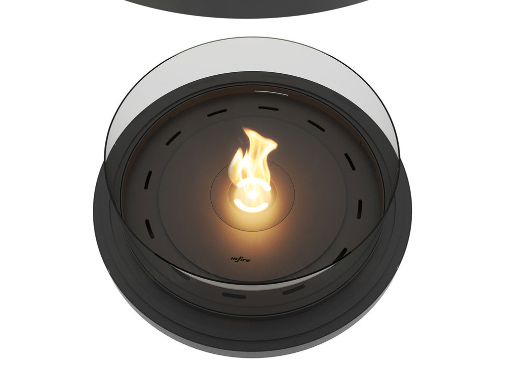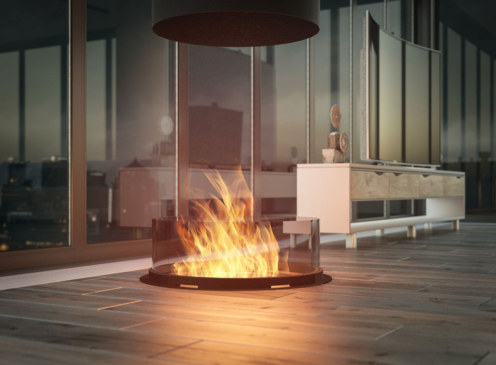 Inround è un biocamino dalla forma inedita. La forma rotonda permette di ammirare il camino da tutti i lati, come un fuoco. La base può essere montata direttamente nel pavimento così come negli edifici, ad esempio nei mobili. Il tubo di design che si appende al soffitto simula la canna fumaria per lo scarico dei fumi (fumi che non ci sono quando si brucia il bioetanolo). Inround è un camino di design che può essere utilizzato in qualsiasi luogo.