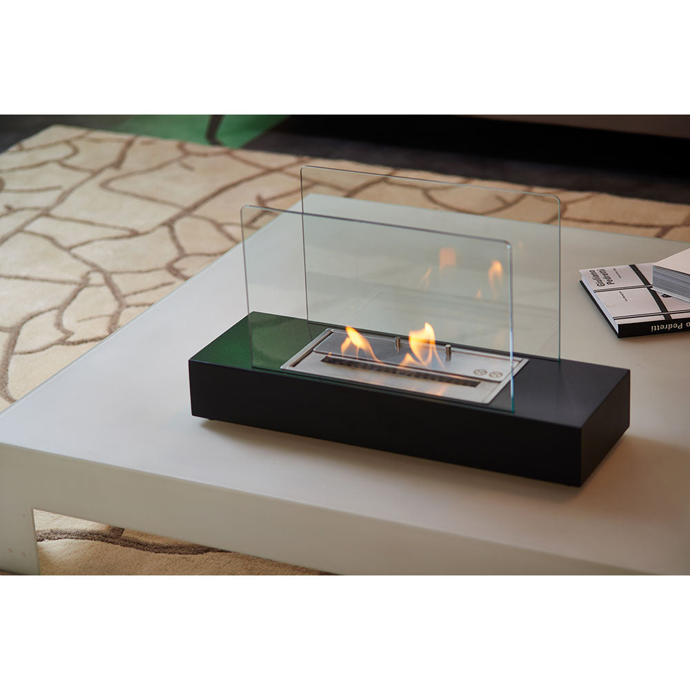 Camino a bioetanolo da tavolo, con 2 vetri temperati di protezione e struttura in acciaio verniciato. Dotato di bruciatore removibile con fibra e coperchio di chiusura fiamma. Installazione semplice che non richiede canna fumaria e allacciamento elettrico. Certificato secondo la normativa EN 16647:2016.
