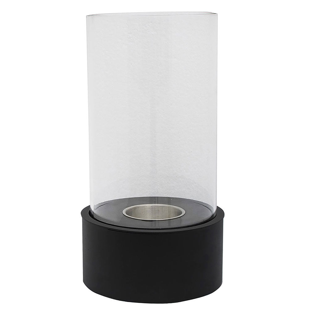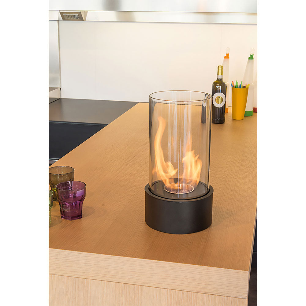 Biocamino da tavolo in acciaio nero opaco e vetro rotondo di protezione. Crea calde atmosfere all'interno della vostra abitazione e protegge dalle zanzare all'esterno, grazie al nuovo Ecofire Garden.